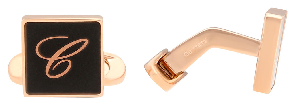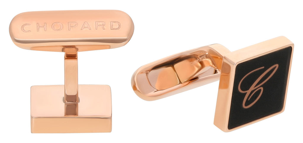 Chopard men's cufflinks. It is square-shaped, made of rose gold PVD steel & black lacquer with a cursive C emblem