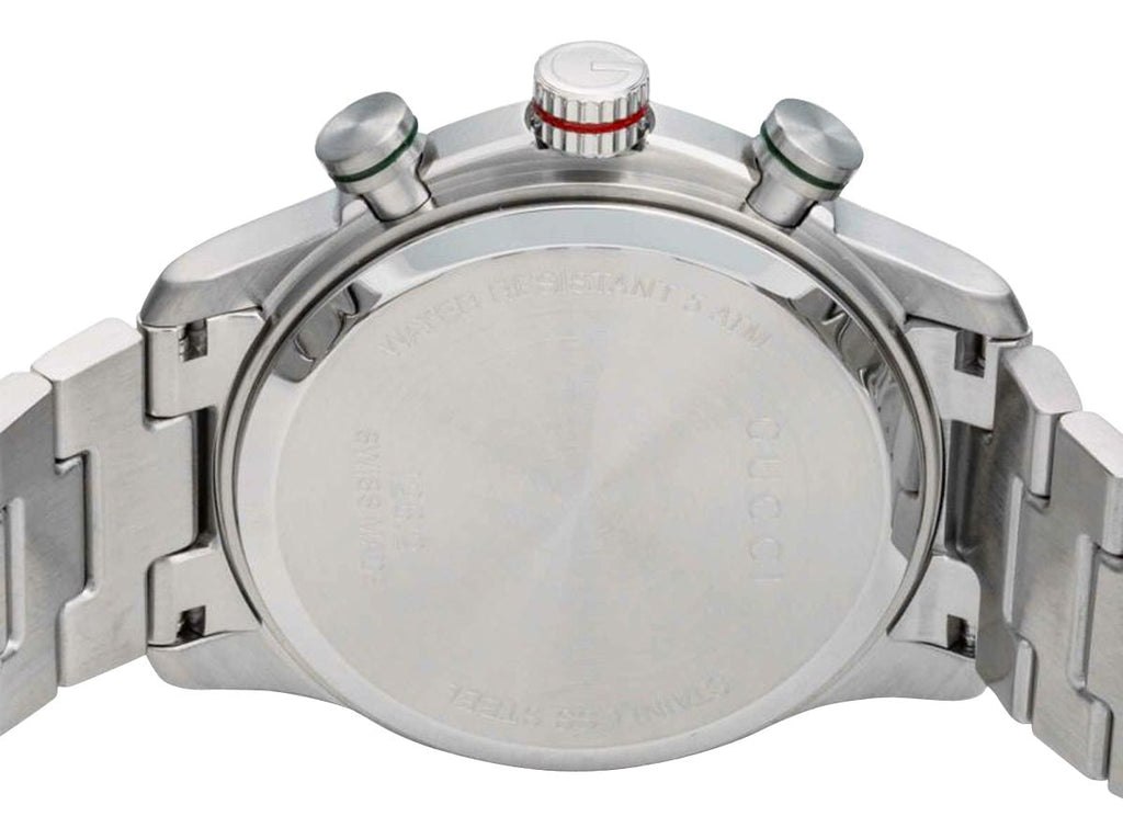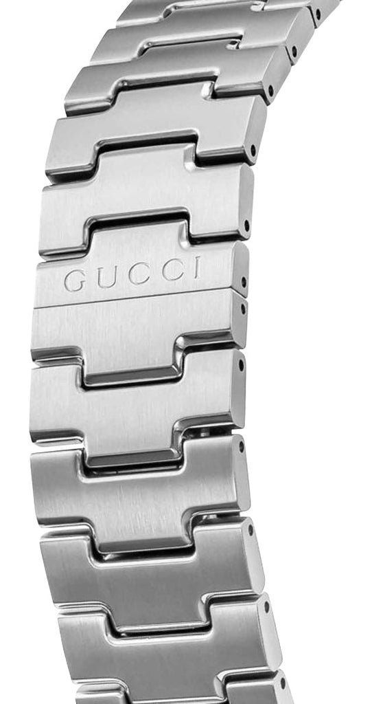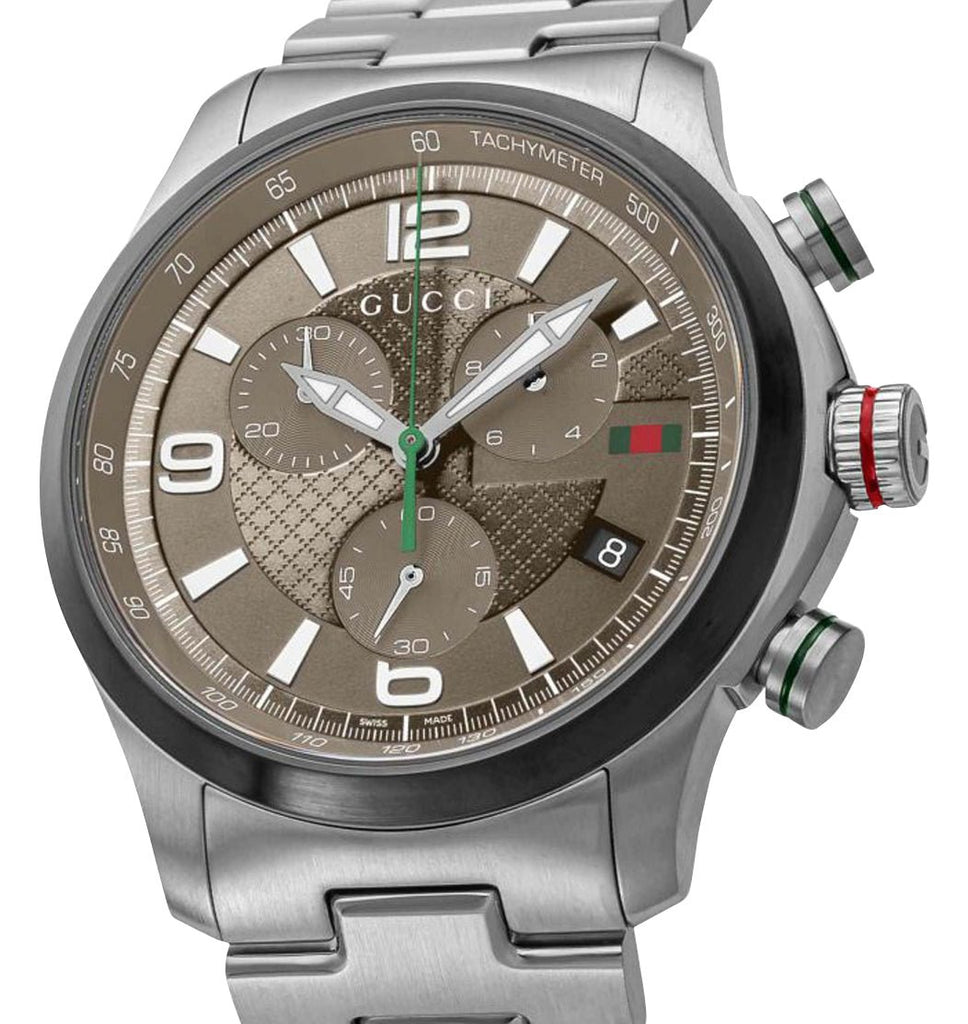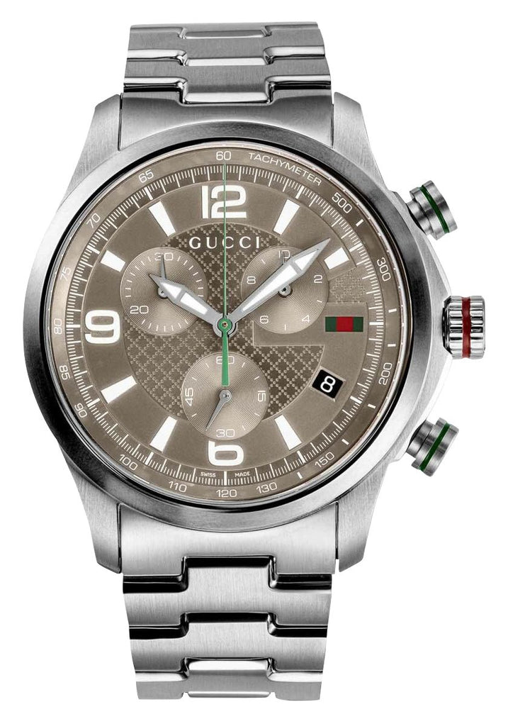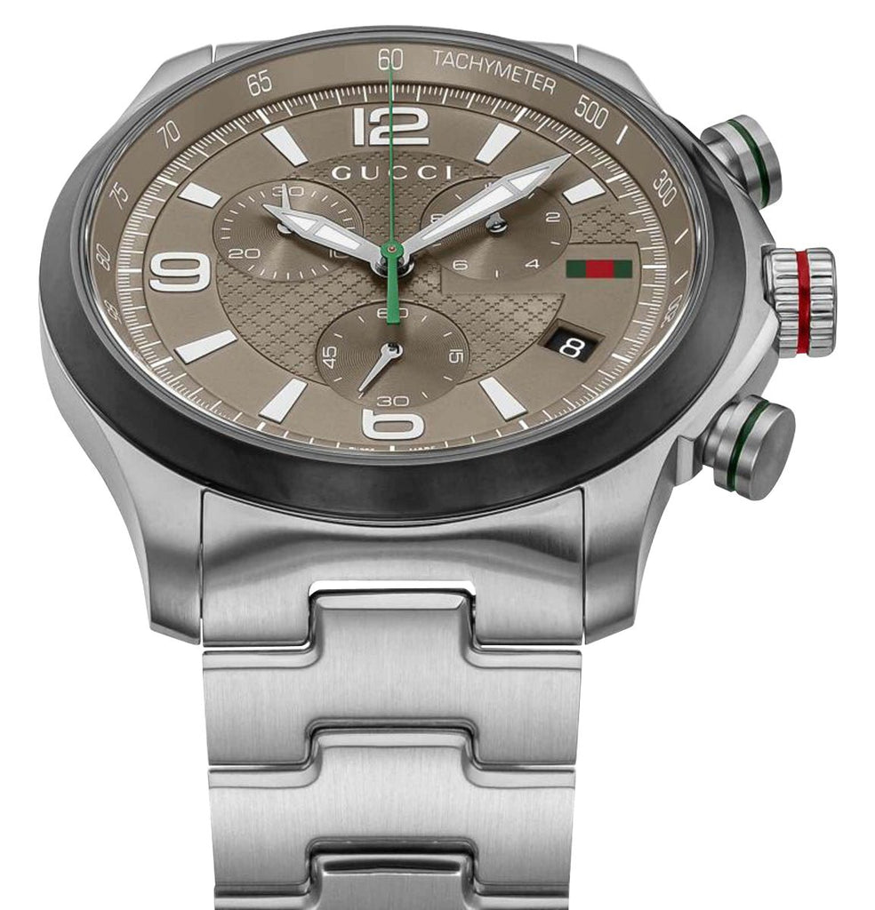 Enriched with signature motifs of the fashion house, Gucci's G-Timeless collection blends tradition, innovation, and contemporary design. This G-Timeless chronograph features a 45 mm stainless steel case that holds a taupe dial, embellished with Gucci's traditional "Diamante" pattern under a scratch-resistant sapphire crystal. It accentuates the silver-tone and luminescent sword hands, white applied indices, and Arabic numerals as hour markers. Subtle expressions of the brand's green and red colors are evident via the chronograph seconds hand, Gucci's sherry line badge at the 3 o'clock position, and crown/pusher accent rings, while the Gucci lettering is laid out just below the 12 o'clock position. Other aesthetic and functional details include a G-shaped detail around the dial's center, a sloped flange with fixed tachymeter scale, chronograph subdials/pump pushers, a date window, and a fluted crown signed with the distinctive Gucci "G" emblem. It is fitted with a stainless steel bracelet and secured by a signed folding clasp. The solid caseback houses a reliable Swiss quartz chronograph movement and is water-resistant up to 50 meters/165 feet.