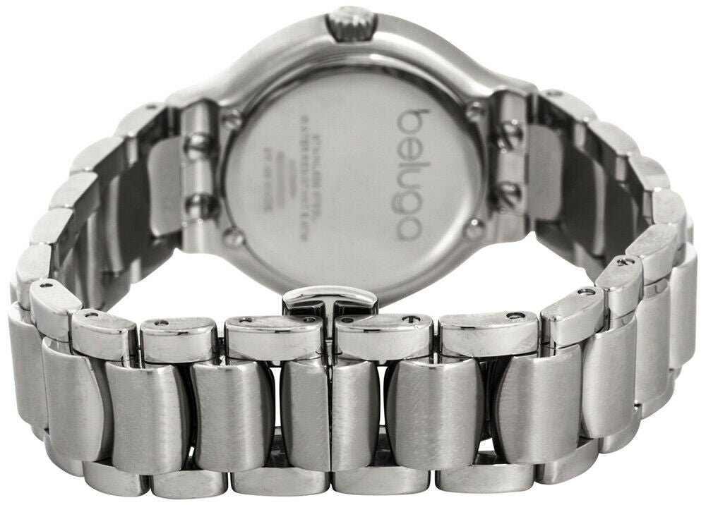 The Ebel Beluga Mother of Pearl Stainless Steel Quartz Womens Watch Model # 1216038 features a brushed and polished stainless steel case that has brushed and polished stainless steel bracelet attached to it. The mother of pearl dial features diamond hour markers and silver-tone hands. The analog watch runs on Quartz movement. The scratch-resistant sapphire crystal is held into place by a fixed stainless steel bezel. The hidden fold-over clasp provides a secure fit. Its pull/push crown is easy to operate. You can wear the watch in rainy and mildly wet conditions as it has a water resistance of 30 meters/100 feet.Like all of our watches, this Ebel Beluga Mother of Pearl Stainless Steel Quartz Womens Watch is Brand New, and comes in its original packaging!