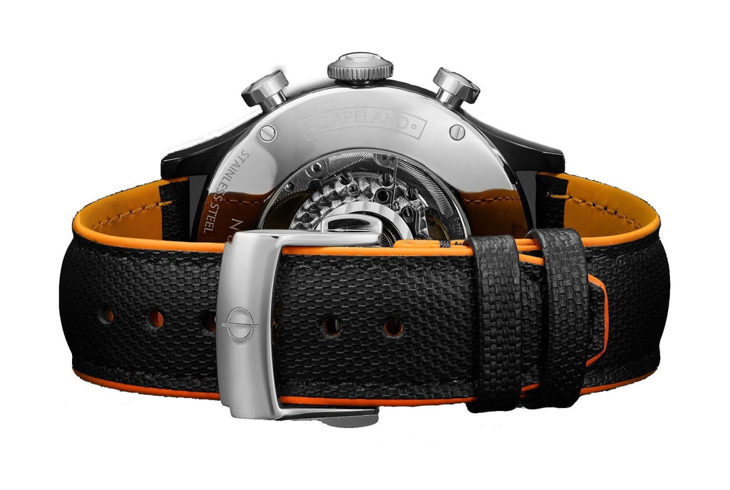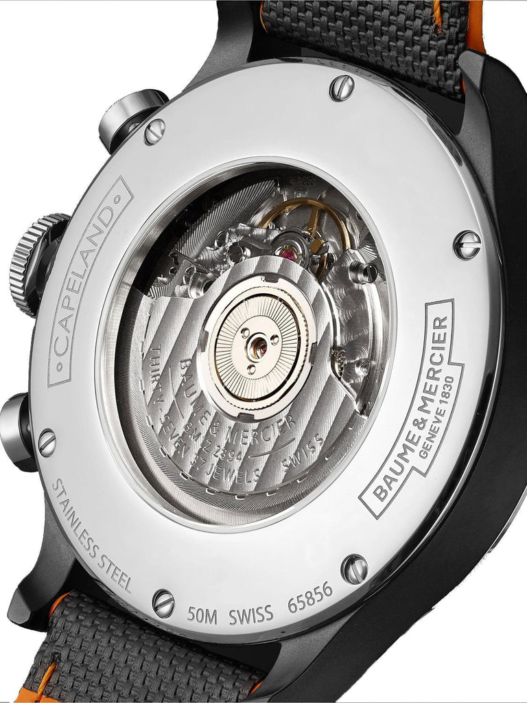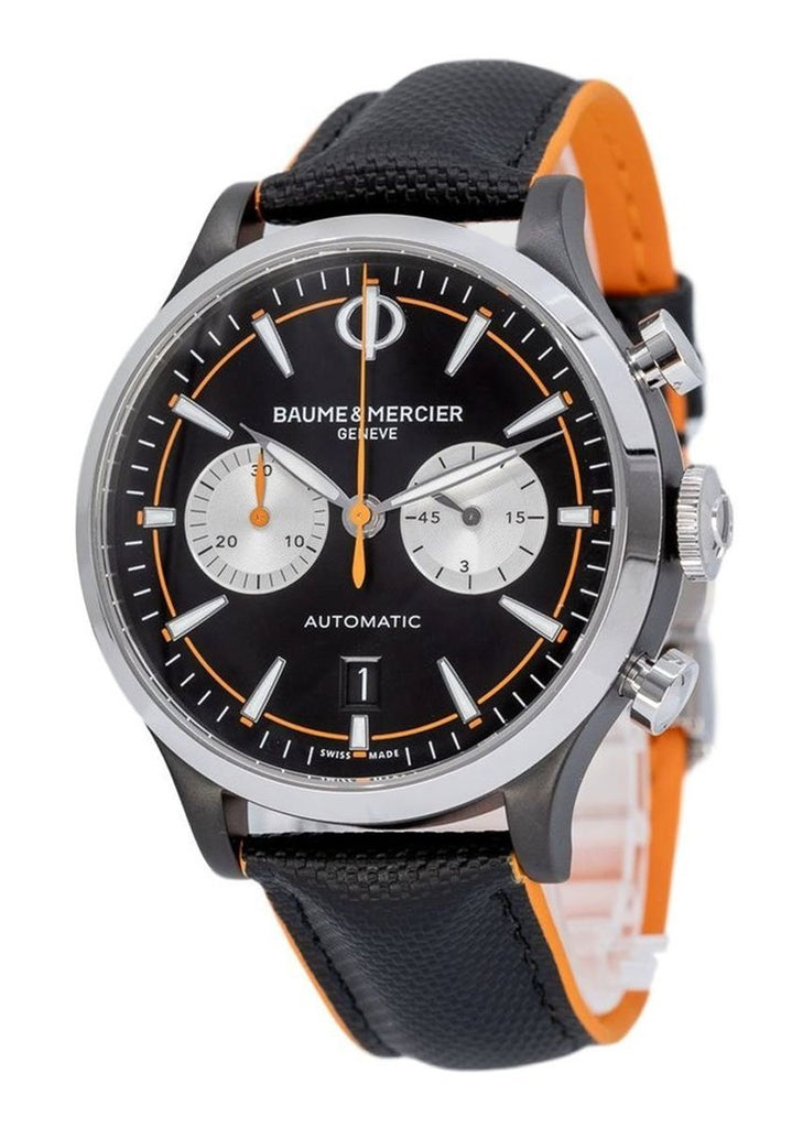 Baume & Mercier Capeland Automatic Chronograph Stainless Steel Black Dial Mens Strap Watch Model# M0A10451 / MOA10451 features a polished stainless steel case with ADLC-coated middle section, black dial with orange accents & silver sub-dials, Rhodium-plated & luminous hands, Rhodium-plated index hour markers, date display at the 6 o'clock position and is topped with a sapphire crystal, black sailcloth-textured genuine calfskin leather strap with an orange back side, push button fold-over safety clasp, Transparent case back, This watch runs on a Swiss automatic chronograph self-winding movement, Caliber ETA 2894-2, 37 jewels, 28,800 Vph, 42 hour power reserve, water-resistant up to 5 ATM - 50 meters/165 feet.Like all of our watches, this Baume et Mercier Capeland Automatic Chronograph Stainless Steel Black Dial Mens strap watch is brand new and comes in its original packaging.