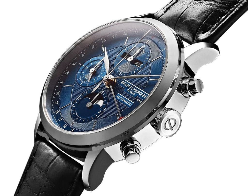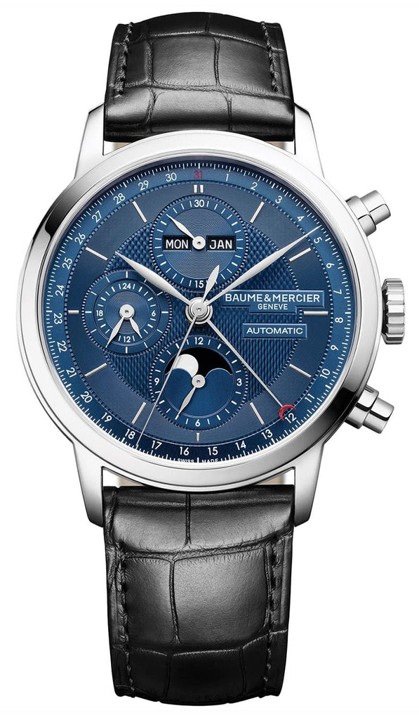 Baume & Mercier Classima Automatic Chronograph Blue Dial Black Leather Strap Moonphase Day-Date Month Mens Watch MOA10484