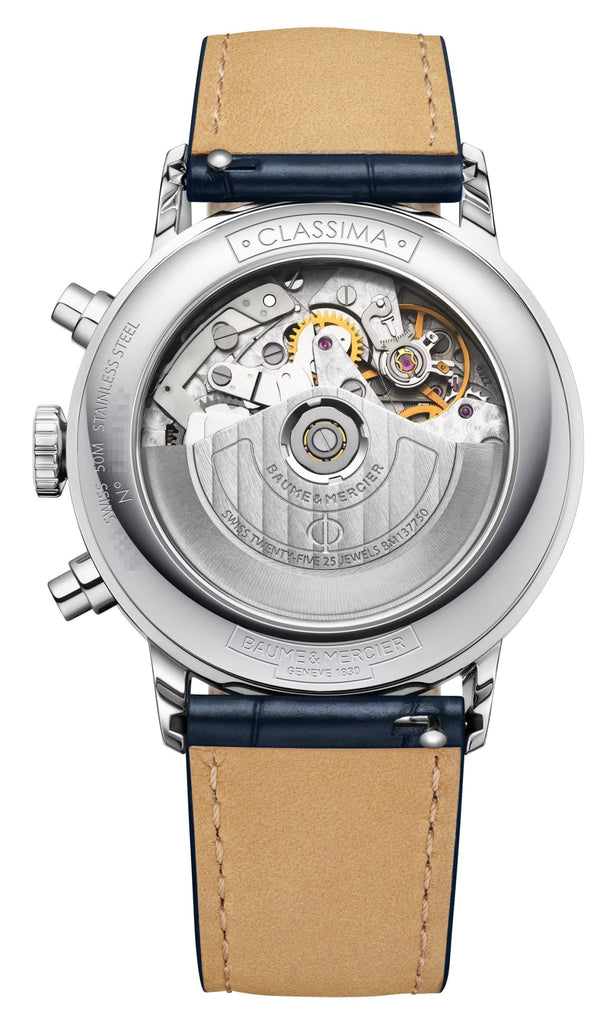 Baume & Mercier brings a touch of modernity to the highly acclaimed Classima series with a wide array of materials. This Classima Chronograph is the epitome of elegance and sophistication with its meticulously crafted design elements. It features a 42 mm stainless steel case with a sunray blue dial while the subdials and minutes track are presented in navy blue. It has rose gold-tone leaf hands and applied indices as hour markers as well as the Arabic numeral minute/subdial markers and rings at the 6 and 12 o'clock positions. Complementing it further is a scratch-resistant sapphire crystal, 3 registers for elapsed time (seconds, minutes & hours), day/date apertures, inverted pushers, and the brand's emblem that is etched on the crown. It is fitted with a blue leather strap and secured by an adjustable triple folding clasp with security push-pieces. This watch has an exhibition case back showcasing the Valjoux-based caliber BM13-7750, a Swiss automatic movement that beats 28,800 vibrations per hour generating up to 48 hours of power reserve, and is water-resistant up to 50 meters/165 feet.