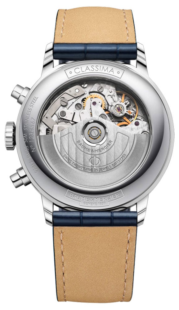 Baume & Mercier Classima Automatic Chronograph Stainless Steel Blue Leather Strap Silver Dial Date Mens Watch M0A10330 Classima Automatic Chronograph Blue Leather Date Mens Watch Previous NextWatches - Mens