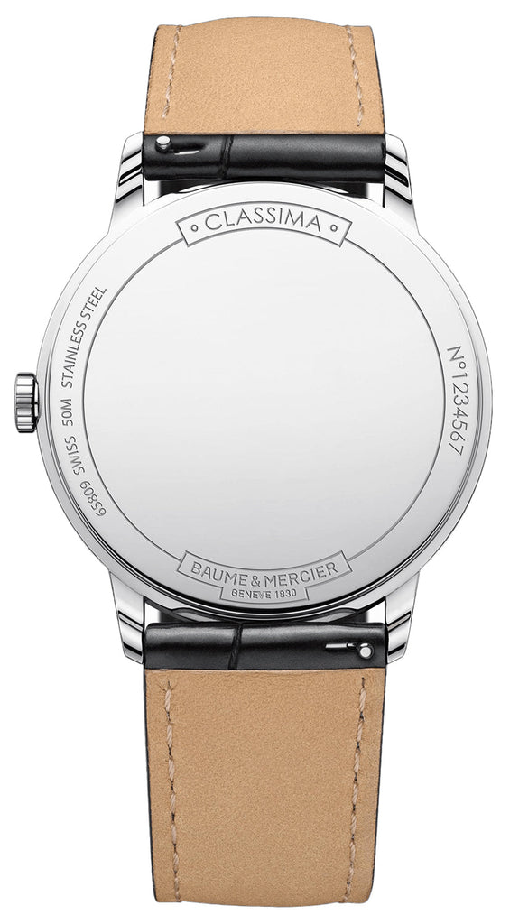 Baume & Mercier Classima 10323 Stainless Steel White Dial Black Leather Strap Date Quartz Mens Watch Model# M0A10323 / MOA10323 this 40 mm round watch with a polished steel bezel and rich black leather strap is a sleek Swiss watch for men who understand the minimalist sentiment. Roman numerals, a crisp white dial and rhodium-plated hour and minute hands give this timepiece an unquestionable quality. Taste, style, and comfort, the Classima 10323, driven by a quartz movement, offers it all and is water-resistant up to 50 meters/165 feet.