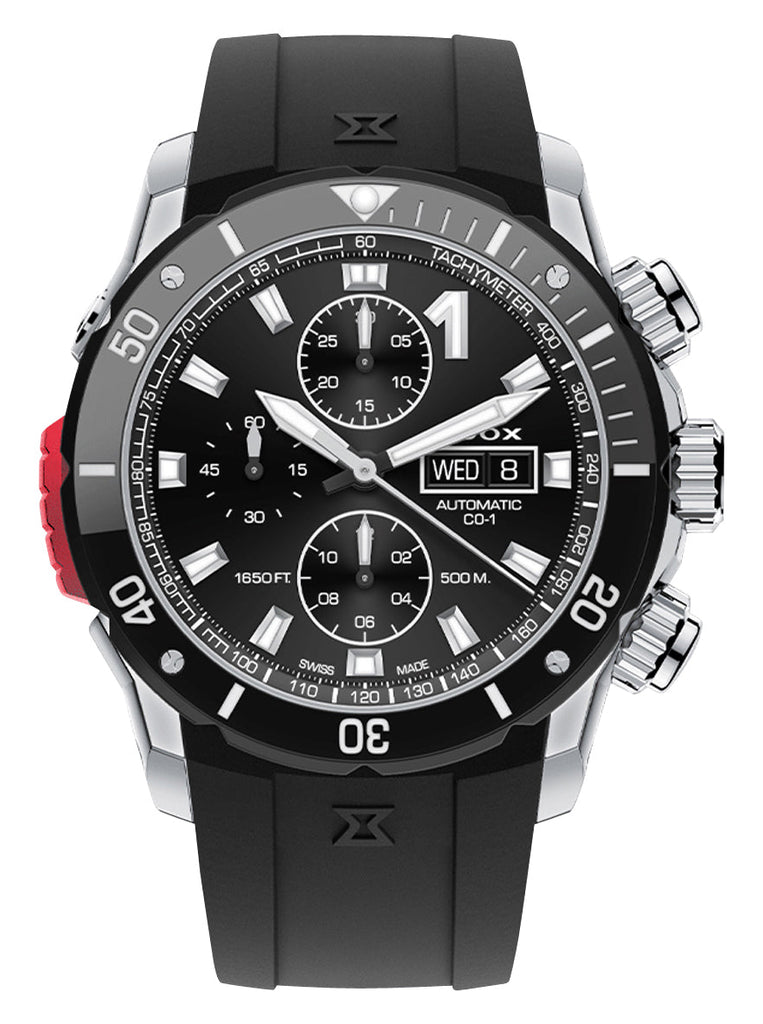 Primarily engineered in 2006 for offshore powerboat racing and the ultimate in dive watch engineering performance and design, the Edox CO-1 is a master beneath the fantastic world of waves. This tough and durable Chrono Offshore-1 features a 45 mm stainless steel case that holds a stealthy black dial under a scratch-resistant sapphire crystal and bordered by a uni-directional rotating black ceramic bezel with a red bezel lock. It has silver-tone and luminescent sword hands, applied indices, and an Arabic numeral 1 as hour markers. Three subdials display 60 seconds, 12 hours, and 30 minutes. The day/date aperture sits at the 3 o'clock position. The screw-down crown flanked with screw-down pushers operates the time, calendar, and chronograph functions. This watch is equipped with a black rubber strap and secured by an adjustable folding clasp with push-button release. This watch has a screw-down exhibition caseback showcasing the Sellita-based Caliber 011, a Swiss automatic chronograph movement beating at 28,800 vibrations per hour, generating up to 48 hours of power reserve and is water-resistant up to 500 meters/1650 feet.