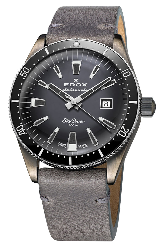 A collection rumored to be launched following a Swiss colonel's secret request for their parachute troops in the 1960's, hence the name Skydiver. This limited edition Skydiver of only 600 pieces combines the no-nonsense functionality of a dive watch with the style and aesthetic of a pilot's watch. It features a 42 mm "aged" stainless steel case with a smoky gradient gray dial under a scratch-resistant domed sapphire crystal and bordered by a uni-directional rotating dive bezel on a black ceramic top ring. It has silver-tone and luminescent obelisk hands, applied trapezoidal indices as hour markers, and a more prominent minute track. The oversized screw-down crown is at the 3 o'clock position, adjacent to the date aperture. This watch is equipped with a gray leather strap and secured by a black PVD-coated steel signed buckle. It also comes with an interchangeable brown leather strap and travel pouch. The decorated stainless steel caseback features an engraving of a paratrooper unit emblem and Edox logo, wherein underneath lies the Sellita-based Caliber 80, a Swiss automatic movement beating at 28,800 vibrations per hour, generating up to 38 hours of power reserve and is water resistant to 300 meters/1000 feet.