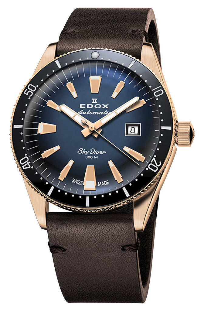 Limited Edition Edox Skydiver Automatic Bronze Blue Dial Brown Leather Interchangeable Black Leather Strap Date Divers Mens Watch 80126-BRN-BUIDR