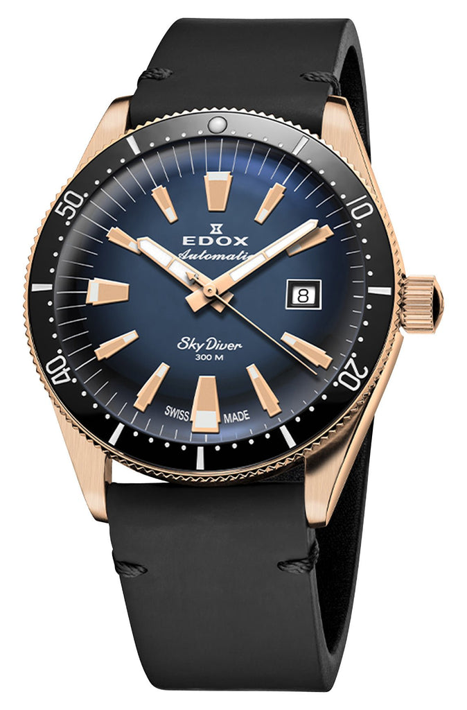 A collection rumored to be launched following a Swiss colonel's secret request for their parachute troops in the 1960's, hence the name Skydiver. This limited edition Skydiver of only 600 pieces combines the no-nonsense functionality of a dive watch with the style and aesthetic of a pilot's watch. It features a 42 mm bronze case with a gradient navy blue dial under a scratch-resistant domed sapphire crystal and bordered by a uni-directional rotating dive bezel on a black ceramic top ring. It has bronze-tone and luminescent obelisk hands, applied trapezoidal indices as hour markers, and a more prominent minute track. The oversized bronze screw-down crown is at the 3 o'clock position, adjacent to the date aperture. This watch is equipped with a brown leather strap and secured by a black PVD-coated steel signed buckle. It also comes with an interchangeable black leather strap and travel pouch. The decorated stainless steel caseback features an engraving of a paratrooper unit emblem and Edox logo, wherein underneath lies the Sellita-based Caliber 80, a Swiss automatic movement beating at 28,800 vibrations per hour, generating up to 38 hours of power reserve and is water resistant to 300 meters/1000 feet.