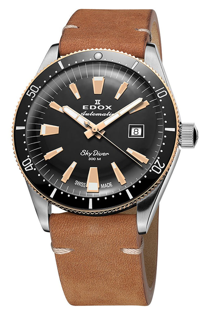 Limited Edition Edox Skydiver Automatic Stainless Steel Black Dial Interchangeable Brown Leather Strap Date Divers Mens Watch 80126-357RNM-NIRB Limited Ed. Skydiver Automatic Steel Black Dial Divers Mens Watch