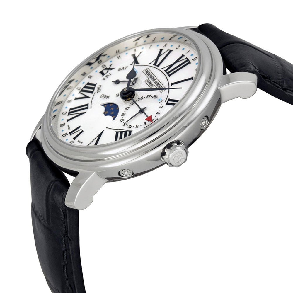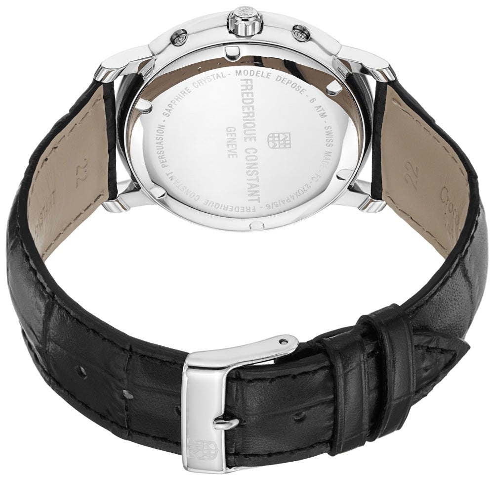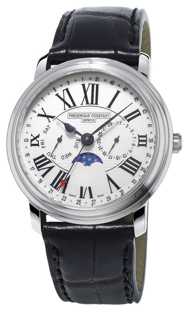 A Frederique Constant is not just a luxurious timepiece. Frédérique Constant is known for its classic and refined watches of exceptional value. Clean lines and a classic look are the characteristics of each watch in the Classics Collection.Frederique Constant Classics Business Timer mens Swiss Luxury Watch Model# FC-270M4P6 , 270M4P6. This Swiss watch features a polished stainless steel case, black genuine crococalf leather strap with tang buckle, White enameled dial with FC logo textured center, black hand indicators, black Roman Numeral hour markers, Moonphase display, Date displayed in the sub-dial at the 3 o'clock position, Day of week displayed in the sub-dial at the 9 o'clock position, 52 Week markers around the outer rim, Anti-reflective scratch-resistant sapphire crystal, Push/Pull crown engraved with the FC logo, Snap-down solid case back, Swiss Quartz Movement, Caliber FC-270, 5 jewels, Water-resistant to 60 meters/196 feet.