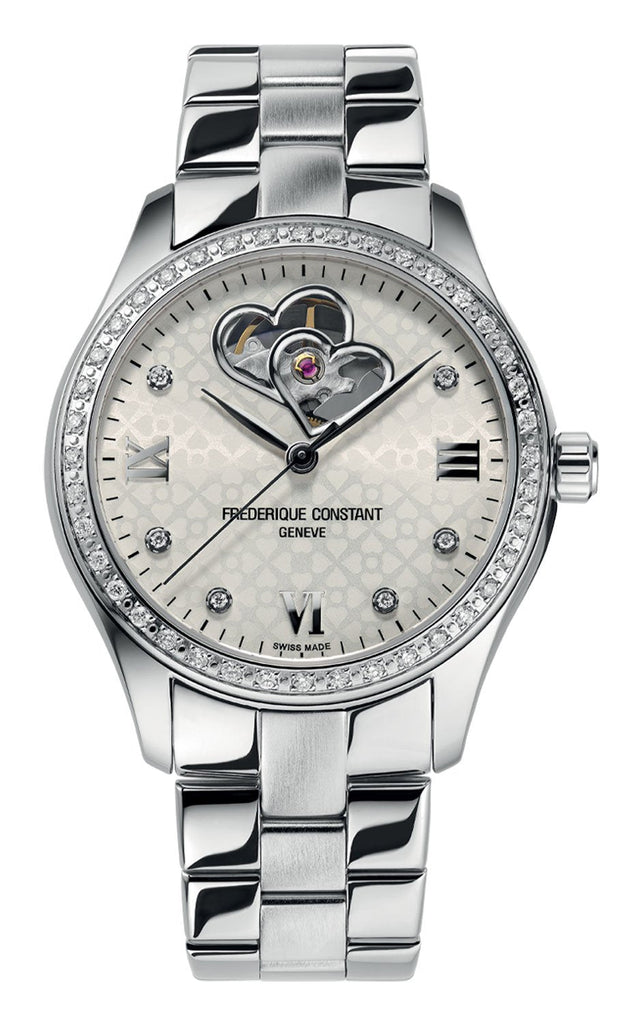 Frederique Constant Double Heart Beat Stainless Steel & Diamond Silver Sunray Heart Design Dial Automatic Womens Watch Model# FC-310WDHB3BD6B / FC310WDHB3BD6B features a polished stainless steel case and diamond set bezel, silver sunray heart design dial and double heart beat. The dial has silver tone hands, Roman numerals & diamond hour markers and a transparent case back. The brushed & polished stainless steel bracelet has a push button deployment clasp. This watch runs on a Swiss automatic movement and is water-resistant up to 50 meters/165 feet.Like all of our watches, this Frederique Constant Double Heart beat Stainless Steel Case Automatic Womens Watch is brand new and comes in its original packaging.
