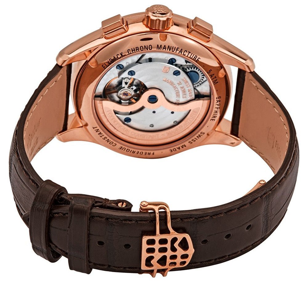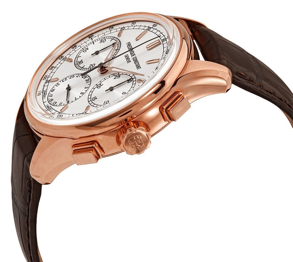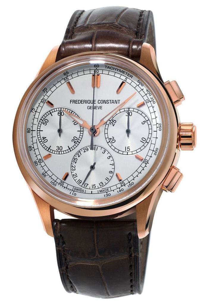 Frederique Constant Flyback Chronograph Manufacture Rose Gold Tone Steel Silver Dial Brown Leather Strap Automatic Mens Watch FC-760V4H4