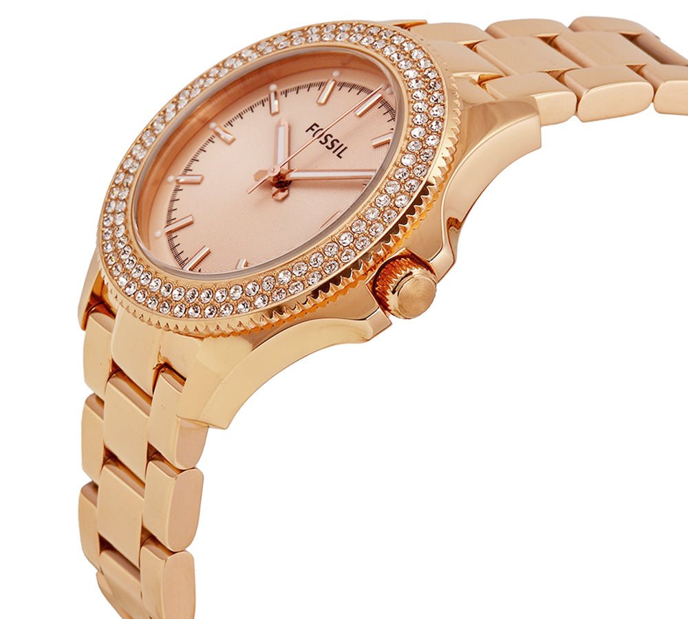 Fossil Retro Traveller Rose Gold-Tone Stainless Steel Rose Gold Dial Date Crystals Quartz Womens Watch AM4454
