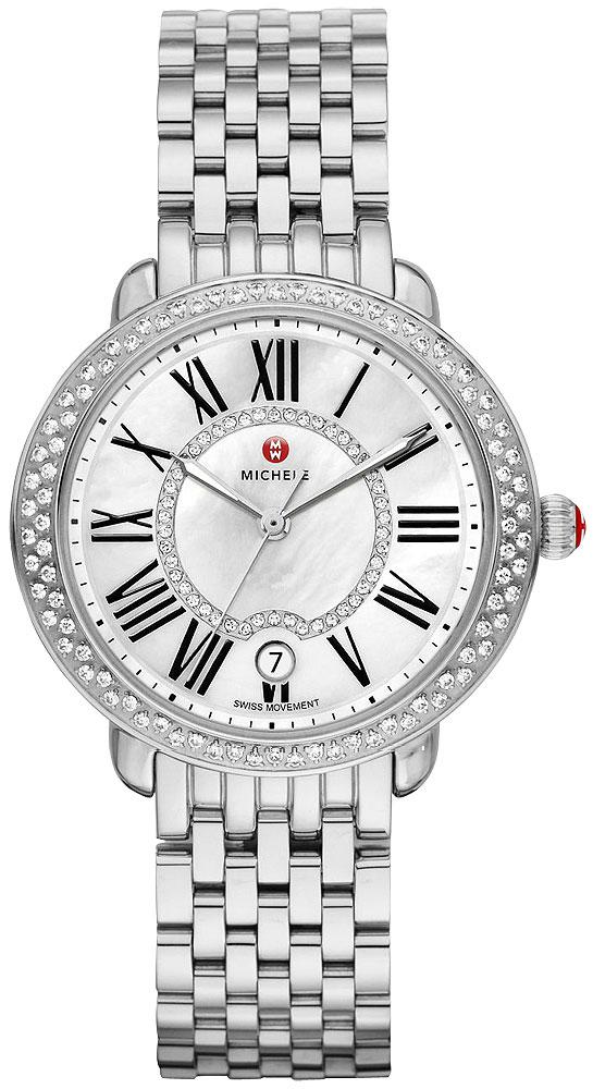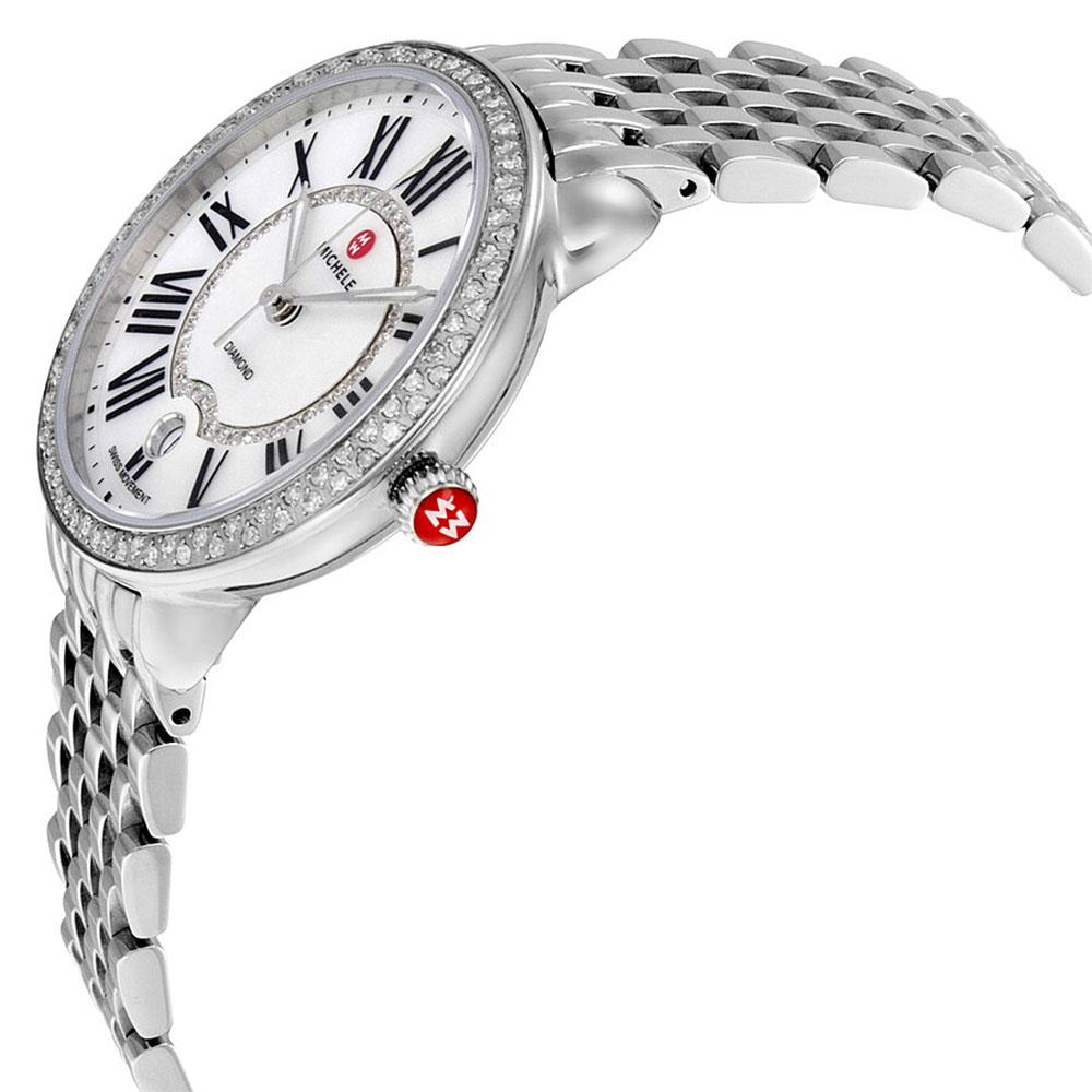 Michele Serein Stainless Steel Diamond Mother-Of-Pearl Dial Date Quartz Womens Watch Model# MWW21B000030.Architectural details frame the bold, 36 mm X 34 mm stainless case of the Serein watch. This Swiss timepiece features a mother-of-pearl dial with a ring of diamonds, date window at the 6 o'clock position, black Roman numerals hour markers and set diamonds on the bezel. The stainless bracelet is interchangeable with any 16 mm MICHELE strap.