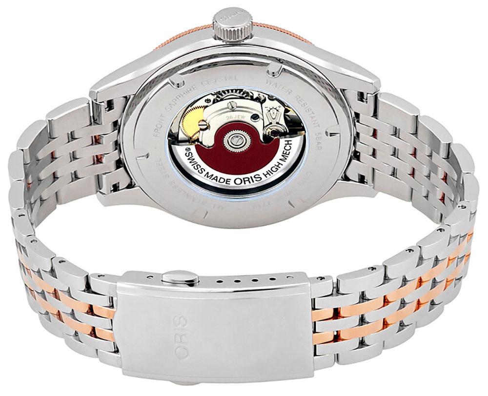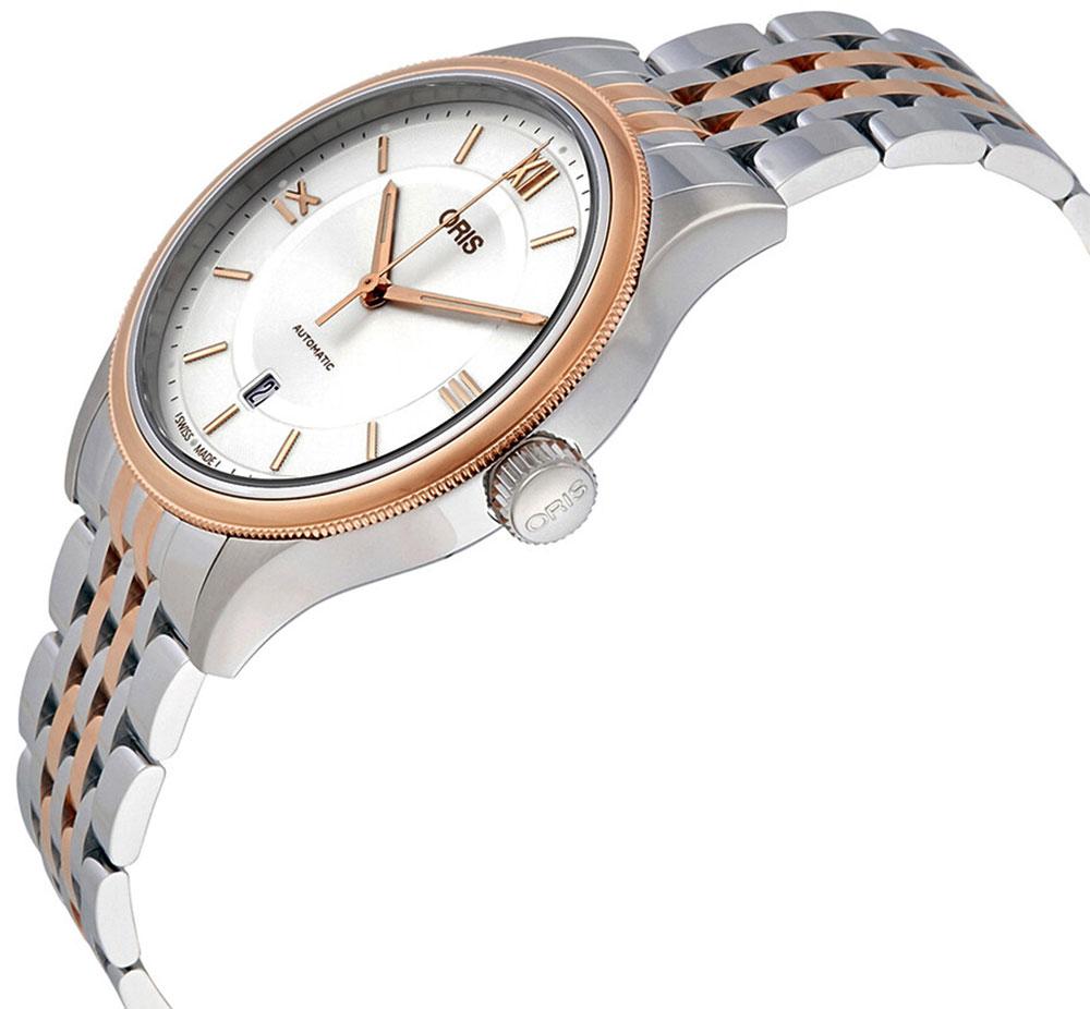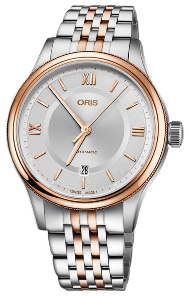 Oris Classic Automatic Two-Tone Stainless Steel Silver-Tone Dial Date Mens Watch Model# 733 7719 4371-MB / 01 733 7719 4371-07 8 20 12 features a brushed and polished stainless steel case that holds the silver-tone dial. The dial has a rose gold-tone & luminous, hands, Roman numerals and indices hour markers, a date display window at the six o'clock position, a rose gold PVD plated bezel, and a transparent case back. The two-tone stainless steel band has a push-button deployment clasp. This watch runs on a Swiss automatic movement and is water-resistant up to 50 meters/165 feet.Like all of our watches, this Classic Automatic Two-Tone Stainless Steel Silver-Tone Dial Date Mens Watch is brand new and comes in its original packaging.