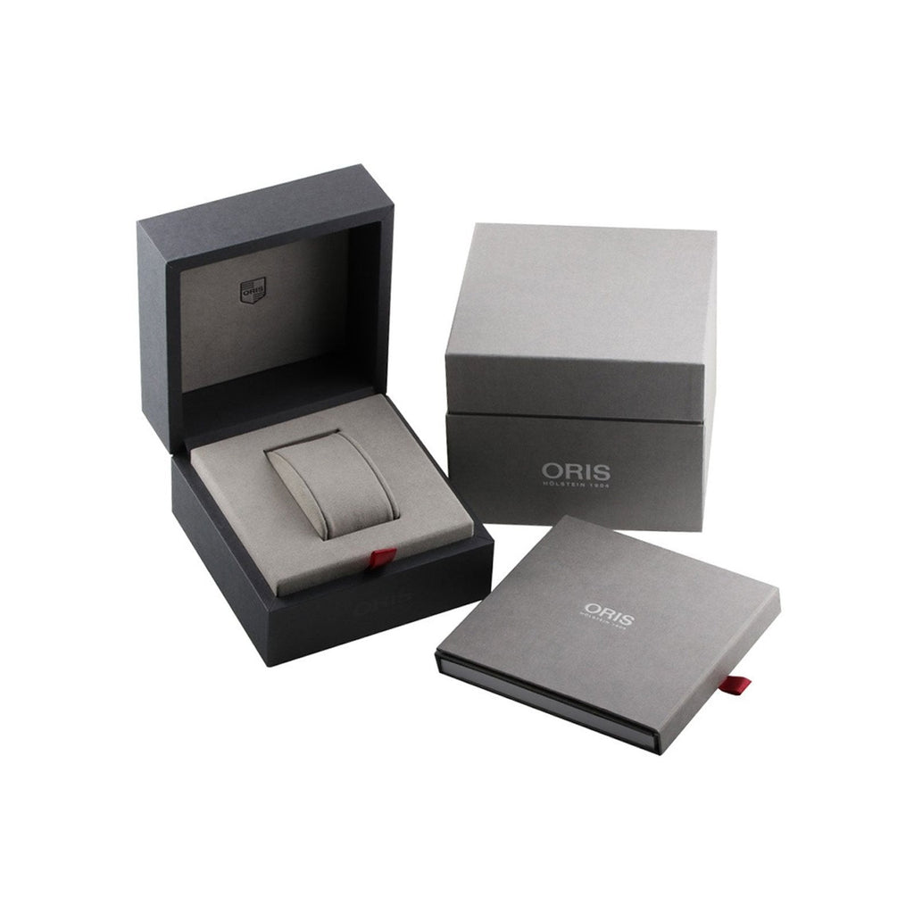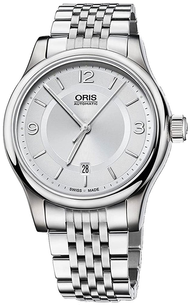 Oris Classic Date Stainless Steel Silver Dial Automatic Mens Watch Model# 733-7594-4031MB features a brushed & polished stainless steel case that holds the silver-tone textured dial. The dial has silver tone & luminous hands, silver tone Arabic Numerals & index hour markers, and a date display window at the six o'clock position. The brushed & polished stainless steel bracelet has a push button fold-over clasp. This watch runs on the Swiss Automatic movement with a 38 hour power reserve and is water-resistant up to 50 meters/165 feet.Like all of our watches, this Oris Stainless Steel Silver Dial Automatic Mens Watch is brand new and comes in its original packaging!