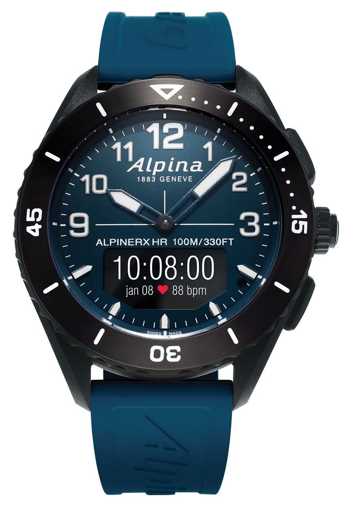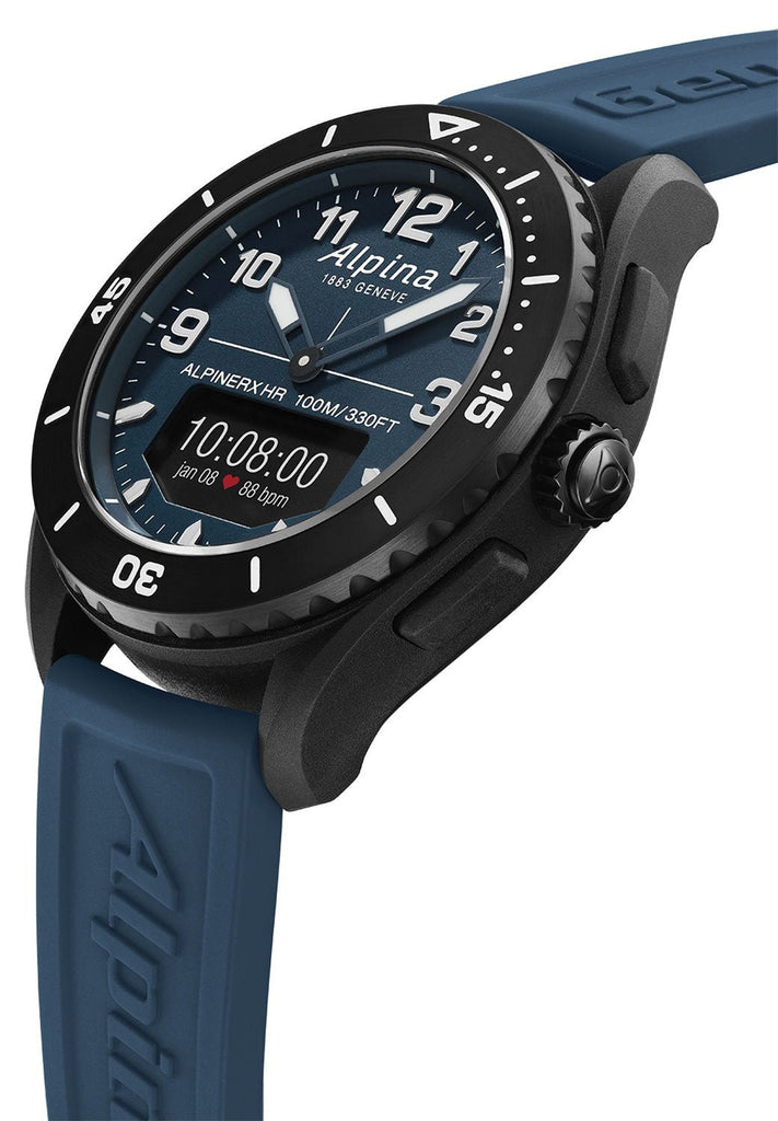 Like all of our watches, this Alpina Alpiner X Alive Smartwatch Black Fiber Glass Case Blue Dial Blue Rubber Strap Interchangeable Blue Nylon Strap Quartz Mens Watch is brand new and comes in its original packaging.