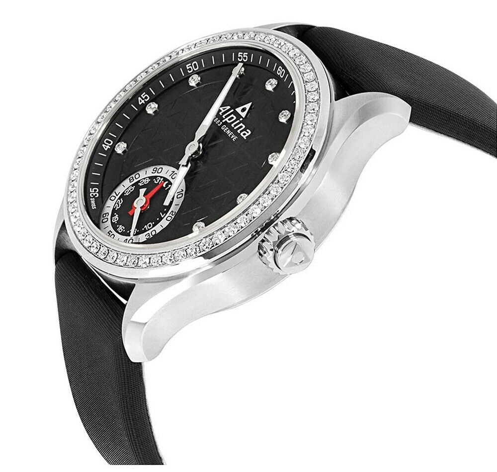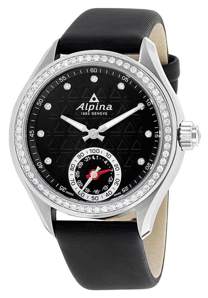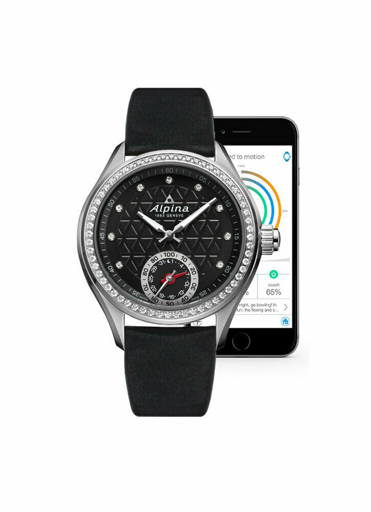 Alpina Horological Smartwatch for ios and android, powered by MOTIONX. This Alpina Swiss Womens Watch Model # 285BTD3CD6 , AL 285BTD3CD6 is sure to impress with its elegant, modern and charming design! This Swiss women's watch is presented in a brushed & polished stainless steel case, Dazzling diamonds set on the bezel, Black Satin Strap with buckle, Black design dial, silver tone & luminous hand indicators, 9 diamond hour markers, Combined date and 1/100th second sub-dial at the 6 o'clock position, Anti-reflective Scratch Resistant Sapphire Crystal, Screwdown crown, Solid case back engraved Alpina 1883 Geneve, Swiss Quartz movement, Engine: MMT-285. Water resistant to 10ATM/100 meters/330 feet.Smartwatch Functions: