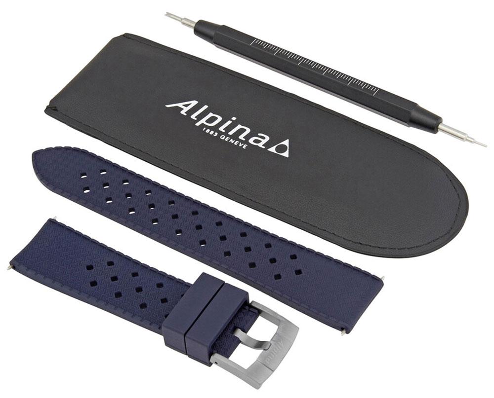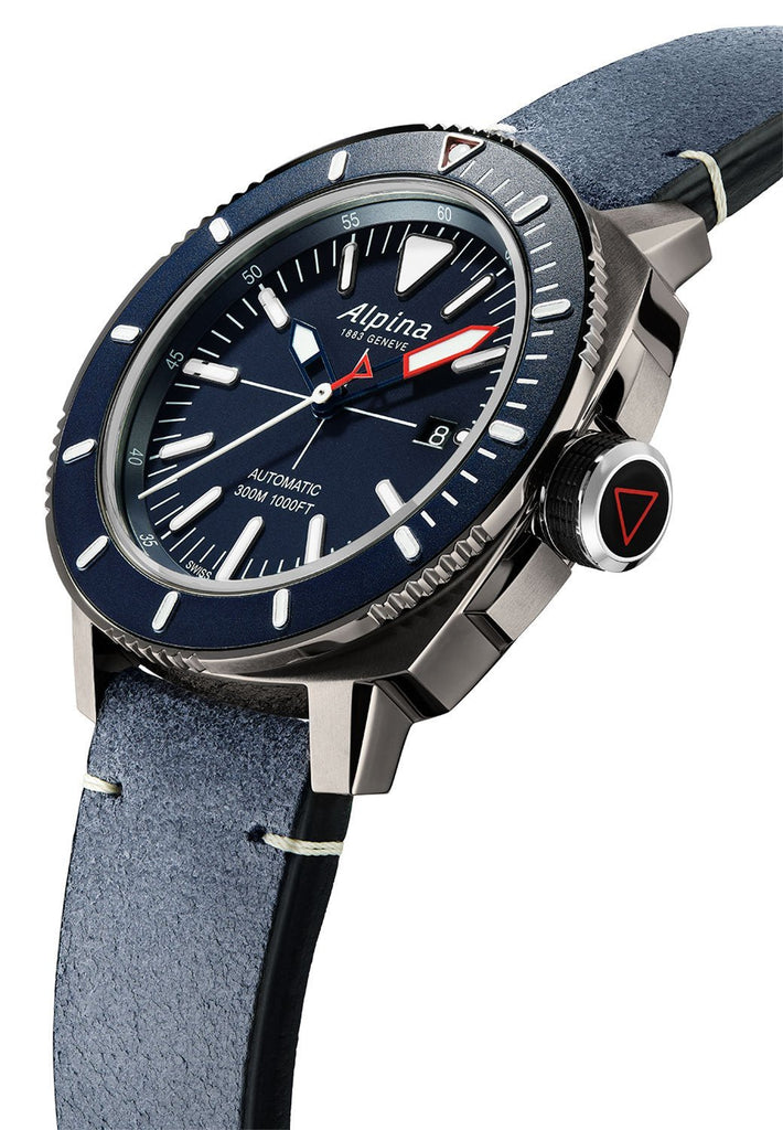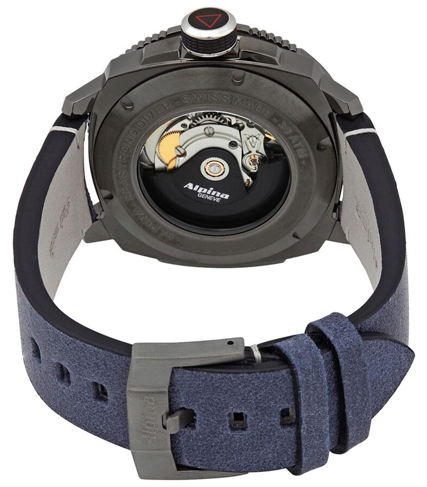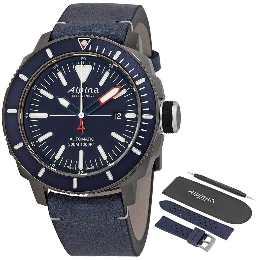Alpina Seastrong Diver 300 Automatic Titanium PVD Case Blue Leather Strap Blue Dial Interchangeable Blue Rubber Strap Date Mens Watch AL-525LNN4TV6