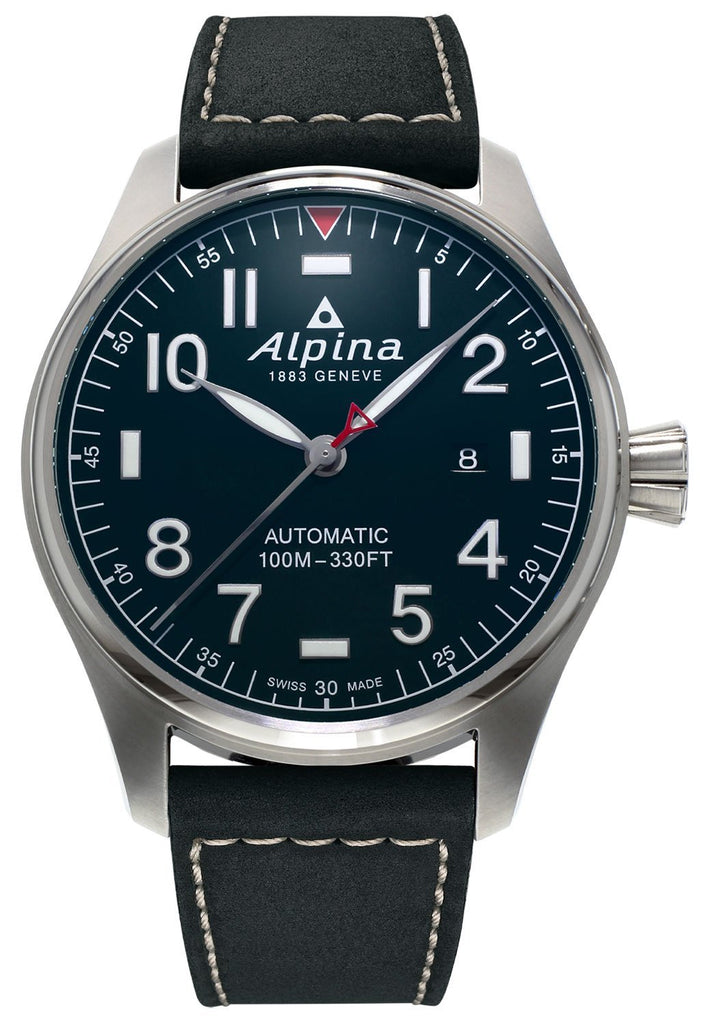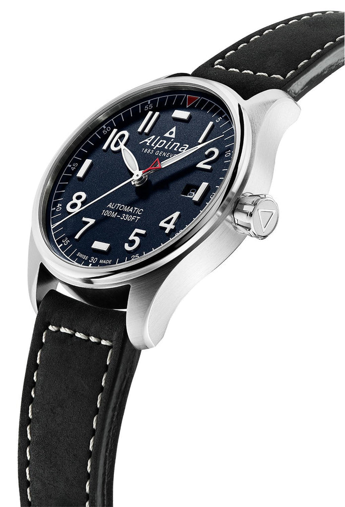 Alpina Startimer Pilot Automatic Stainless Steel Black Leather Strap Blue Dial Date Mens Watch AL-525NN4S6