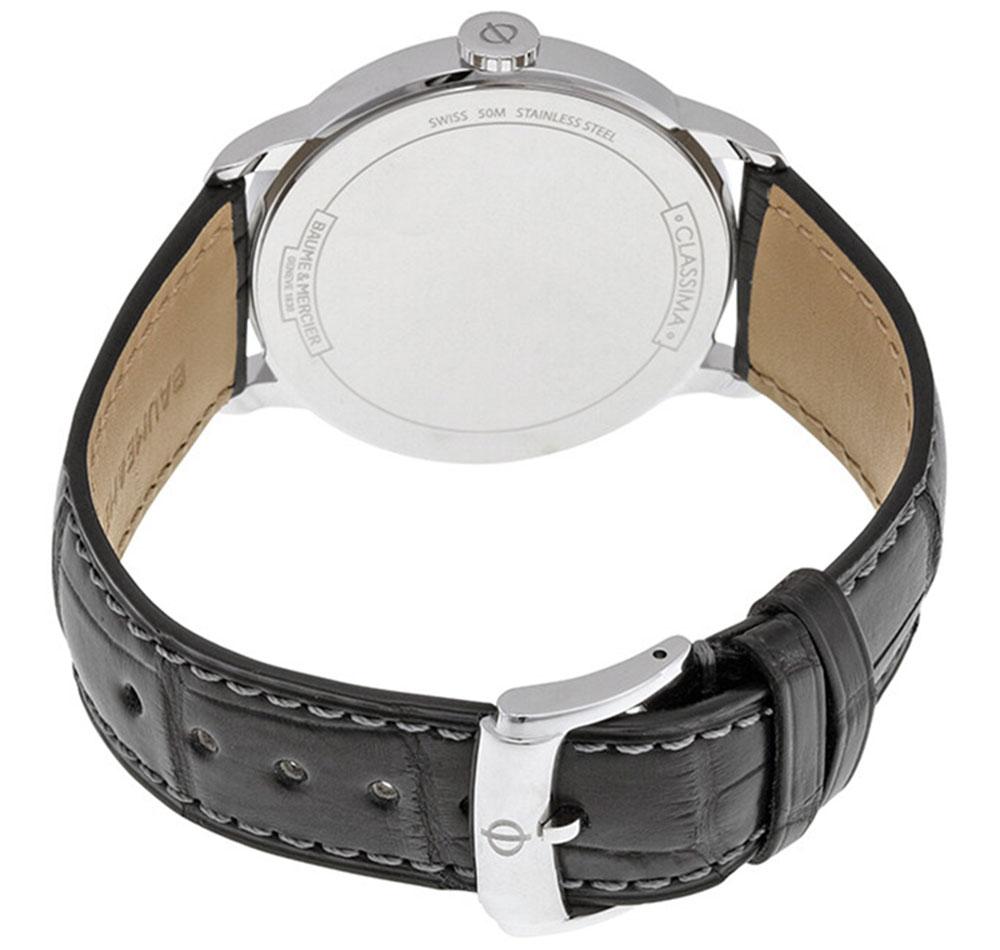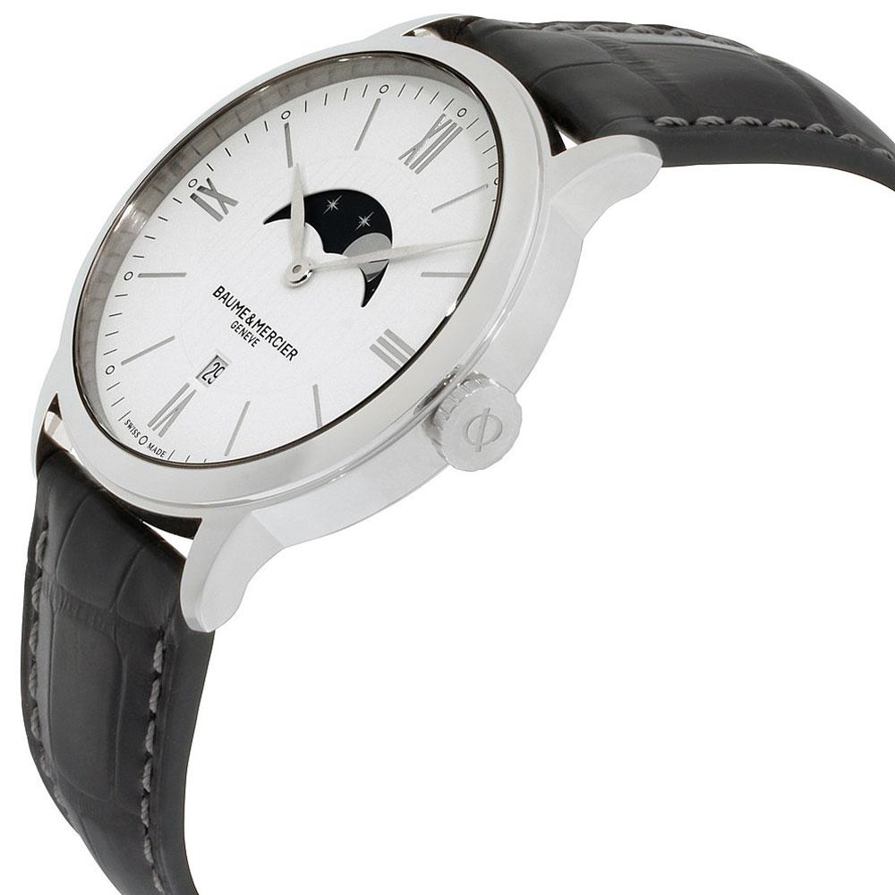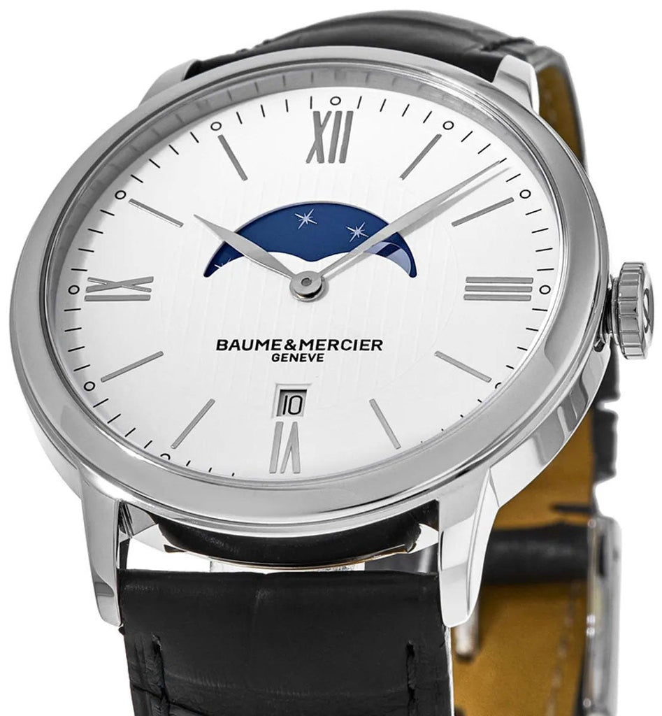 Baume and Mercier Classima White Dial Black Leather Strap Moonphase Date Quartz Mens Watch MOA10219