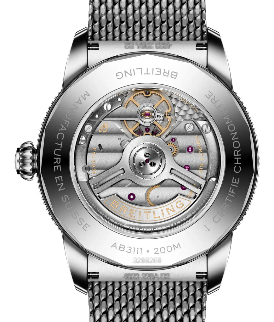 The latest version of the Superocean Heritage was designed for today but with a 1950's soul, building everything that made the original distinctive - and sharpens it by introducing the brand's first exclusive three-hand manufacture caliber. It features a sleeker and slimmer 42 mm stainless steel case that holds a sunray green dial under a scratch-resistant cambered sapphire crystal and bordered by a uni-directional rotating and ratcheted dive bezel on a polished green ceramic top ring. Its signature hands, arrow for hours, spear for minutes, and a lollipop seconds hand are silver-tone and luminescent, similar to the applied indices, which are now faceted & pentagonal in form. The larger encircled index at the 12 o'clock position is also a nod to the 1957 original. This stunning dive watch is also equipped with a conical screw-down crown at the 3 o'clock position with dual gaskets and a date aperture at the 6 o'clock position. Presented in a stainless steel integrated mesh bracelet that is now flush to the case and secured by a signed folding clasp with push-buttons. Showcased through the exhibition caseback is the new Breitling manufacture caliber B31, a Swiss automatic movement beating at 28,800 vibrations per hour, generating an impressive 78 hours of power reserve and is water-resistant up to 200 meters/660 feet.