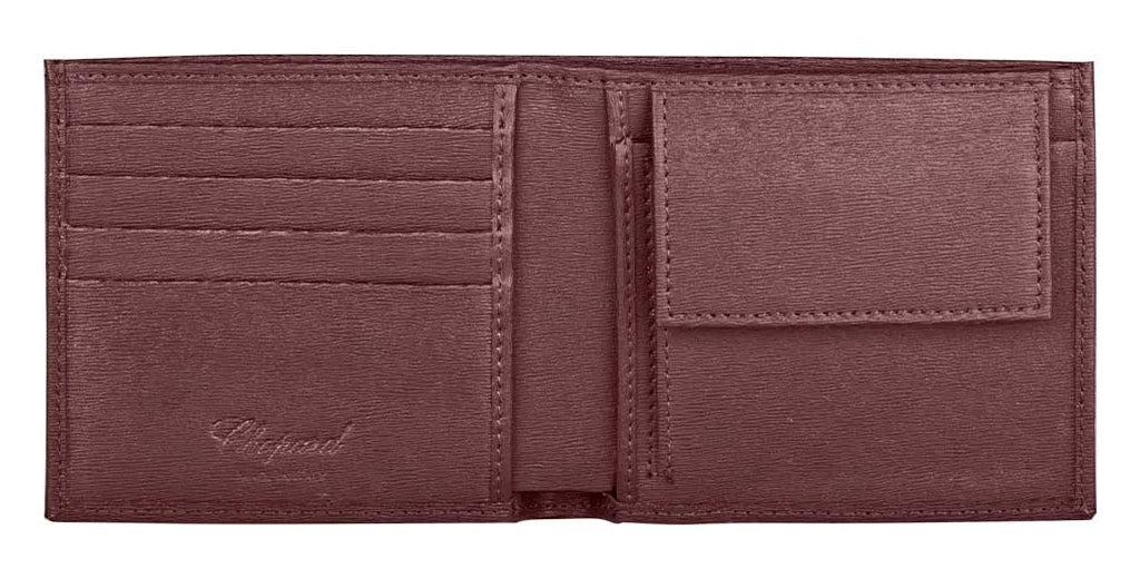Unisex bifold wallet from Chopard. Made of burgundy calfskin leather with compartmentsfor bills, cards and coinsShipping Information