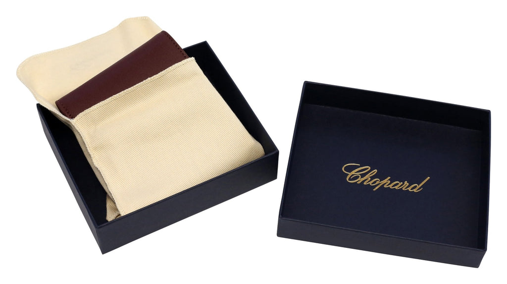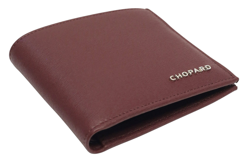 Unisex bifold wallet from Chopard. It is made of burgundy calfskin leather with multiple compartments