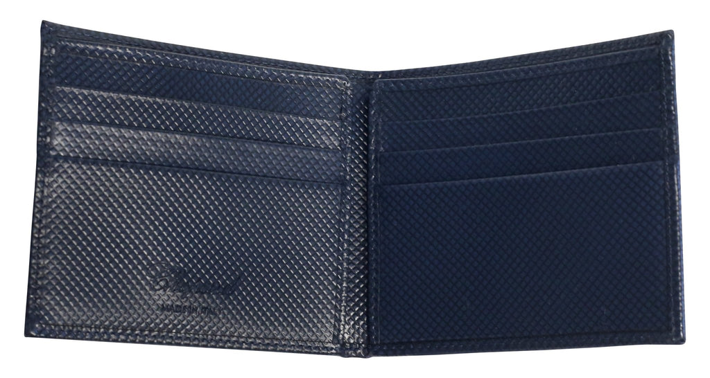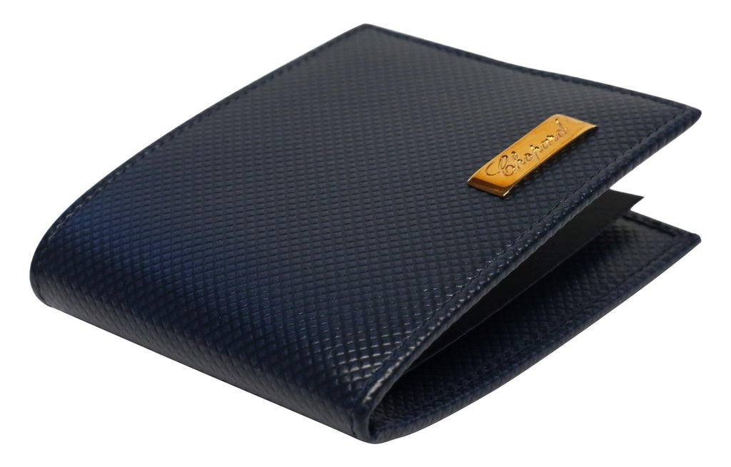 Unisex mini bifold wallet from Chopard. It is made of dark blue calfskin leather with multiple compartments