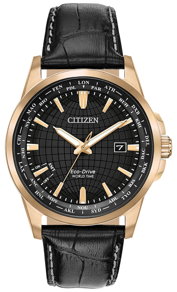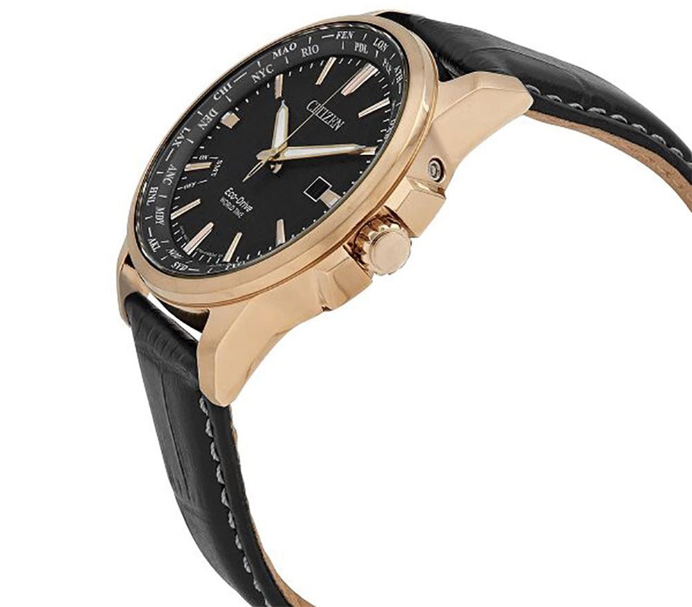 Citizen World Time Perpetual Calendar Rose Gold Steel Black Leather Black Dial Quartz Eco-Drive Date Mens Watch BX1003-08E