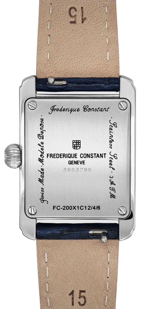 Frederique Constant Classics Carree Stainless Steel Rectangle Case Blue Leather Strap Silver Dial Quartz Womens Watch Model# FC-200MC16 / FC200MC16 features a rectangular polished stainless steel case that holds the silver-tone dial with a textured center. The dial has black hands and Roman numerals, minute markers around an inner ring, and a solid case back. The blue patent calf leather strap has a buckle clasp. This watch runs on a Swiss quartz movement and is water-resistant up to 30 meters/100 feet.Like all of our watches, this Frederique Constant Classics Carree Stainless Steel Rectangle Case Blue Leather Strap Silver Dial Quartz Womens Watch is brand new and comes in its original packaging.