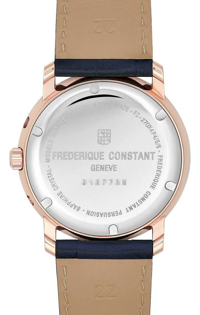 Frederique Constant Classics Index Business Timer Rose Gold Plated Steel Blue Dial Blue Leather Strap Moonphase Day/Date Week Quartz Mens Watch Model# FC-270N4P4 / FC270N4P4