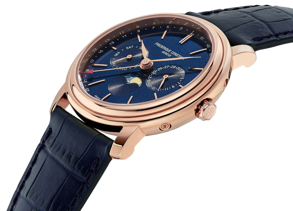 Like all of our watches, this Frederique Constant Classics Index Business Timer Rose Gold Plated Steel Blue Dial Blue Leather Strap Moonphase Day/Date Week Quartz Mens Watch is brand new and comes in its original packaging.