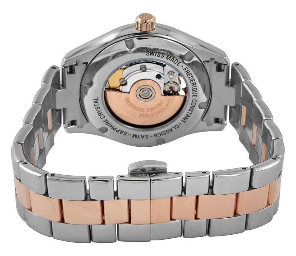 This Frederique Constant Double Heart Beat Two Tone Stainless Steel Automatic Diamonds Gray Dial Womens Watch Model# FC-310LGDHB3B2B has a subtle queenly vibe which makes it ideal to be worn with all types of outfits. The light gray dial is held by a polished stainless steel case. The dial features a beautiful designed sunray pattern, while the bezel is rose gold tone stainless steel which adds more character to the watch. 6 diamonds, rose gold tone Roman numerals and hands complement the overall look of the watch. Additionally, the heart patterned dial has two open hearts through which the movement can be seen. The stainless steel three-link bracelet features rose gold tone accents and has a push button deployment clasp to ensure a secure fit. This watch comes a water-resistance capacity of up to 50 meters/165 feet.Like all of our watches, this Frederique Constant Double Heart Beat Two Tone Stainless Steel Automatic Diamonds Gray Dial Womens Watch is brand new, and comes in its original packaging!
