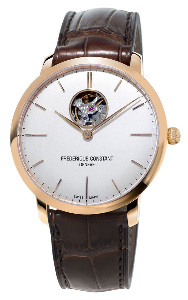 Featuring the classic gentlemanly design, this Frederique Constant Slimline Heart Beat Automatic Silver Dial Brown Leather Strap Mens Watch Model# FC-312V4S4 is perfect to be paired with formal clothing. Its rose gold tone polished stainless steel case holds the silver open heart dial that runs on automatic movement. This watch offers a power reserve of 42 hours. The dial boasts a minimalist design that has rose gold tone indices and hands. The brown calf leather strap is fitted with a rose gold tone fold over deployment clasp to ensure a secure and adjustable fit. The watch comes with 30 meters/100 feet of water-resistance.Like all of our watches, this Frederique Constant Slimline Heart Beat Automatic Silver Dial Brown Leather Strap Mens Watch is brand new, and comes in its original packaging.