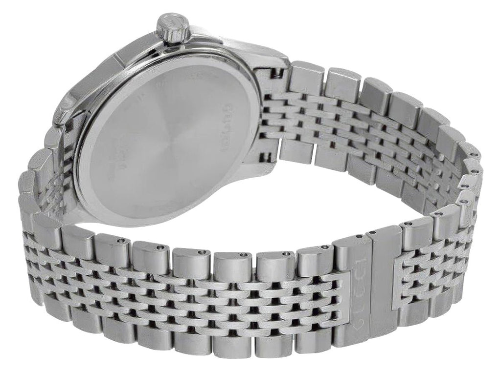 Enriched with signature motifs of the fashion house, Gucci's G-Timeless collection blends tradition, innovation, and contemporary design. This gents' G-Timeless features a 38 mm stainless steel case that holds a black textured dial, engraved with Gucci's traditional "Diamante" pattern under a scratch-resistant sapphire crystal. It complements the black and luminescent leaf hands and applied silver-tone indices as hour markers. Subtle expressions of the brand's interlocking G's and Gucci lettering in white are laid out at the 6 and 12 o'clock positions, respectively. Other aesthetic and functional details include a beveled date window at the 4 o'clock position, matte-finished G-shaped detail around the dial's center, and a fluted crown signed with the distinctive Gucci "G" emblem. It is fitted with a stainless steel bracelet and secured by a push-button folding clasp. The solid caseback houses a reliable Swiss quartz movement and is water-resistant up to 50 meters/165 feet.