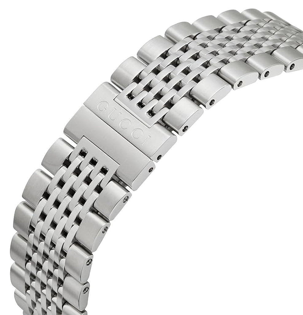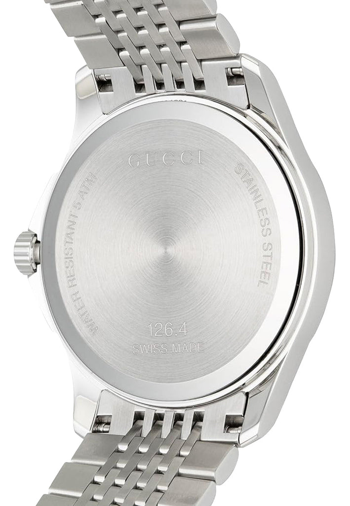 Enriched with signature motifs of the fashion house, Gucci's G-Timeless collection blends tradition, innovation, and contemporary design. This gents' G-Timeless features a 38 mm stainless steel case that holds a warm taupe textured dial, engraved with Gucci's traditional "Diamante" pattern under a scratch-resistant sapphire crystal. It accentuates the silver-tone and luminescent leaf hands and applied indices as hour markers. Subtle expressions of the brand's interlocking G's and Gucci lettering in white are laid out at the 6 and 12 o'clock positions, respectively. Other aesthetic and functional details include a beveled date window at the 4 o'clock position, sunray-finished G-shaped detail around the dial's center, and a fluted crown signed with the distinctive Gucci "G" emblem. It is fitted with a stainless steel bracelet and secured by a push-button folding clasp. The solid caseback houses a reliable Swiss quartz movement and is water-resistant up to 50 meters/165 feet.