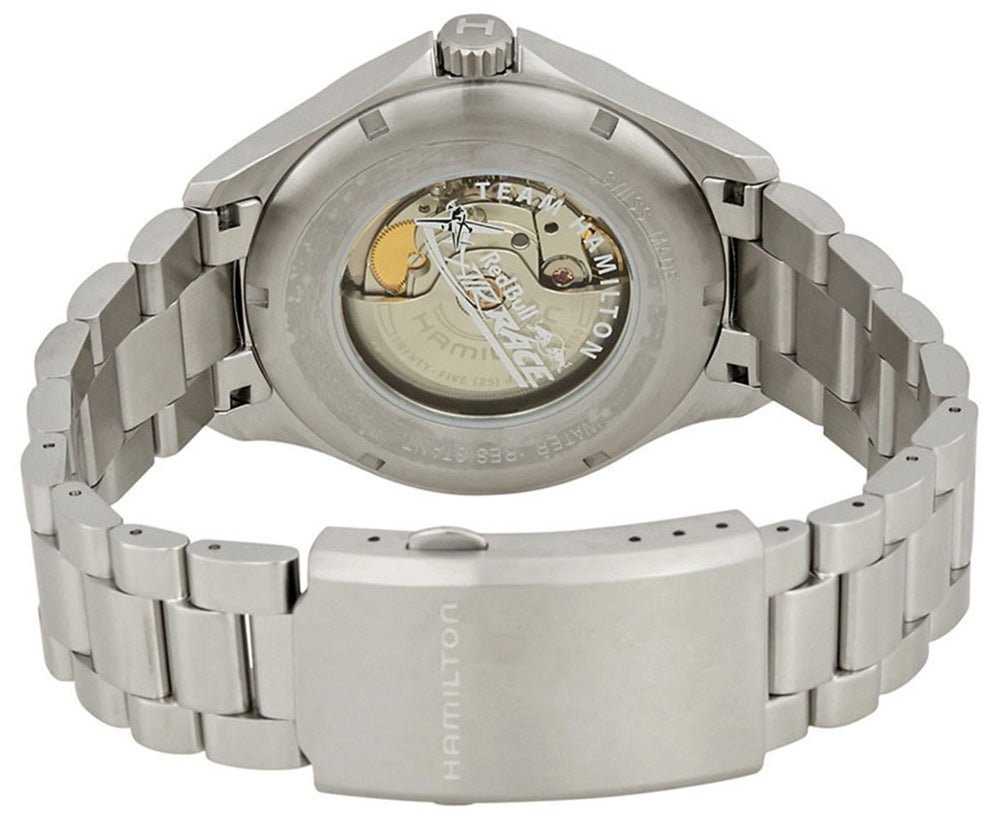 This Hamilton Khaki Aviation Air Race Stainless Steel Black Automatic Dial Bracelet Strap Men’s Watch Model# H76535131 boasts a trendy autocratic look. This orange and black Team Hamilton version of the special edition Khaki Air Race reflects the colors of Nicolas Ivanoff's race plane. Its stainless steel case holds the black analog dial. Running on automatic movement, the dial has a date display window at 3 o’clock position. It has orange luminescent Arabic numeral & index hour markers. The skeleton silver tone, black and orange luminescent hands complement the color scheme of the dial. This watch has a 3-link brushed stainless steel bracelet that features a fold over push-button deployment clasp closure. It has a Swiss automatic movement with a Hamilton Caliber H-10 which appears with intricate contrasting snail and pearled patterns. The movement has 25 jewels and a power reserve of 80 hours. The watch offers a water resistance capacity of up to 50 meters/165 feet.Like all of our watches, this Hamilton Khaki Aviation Air Race Automatic Stainless Steel Dial Men’s Watch is brand new, and comes in its original packaging.