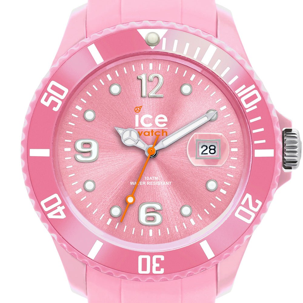 Ice-Watch Ice-Forever Sili Collection Pink Mens Fashion watch Model# SI.PK.B.S.09 / SI PK B S 09. These watches are the latest must have fashion accessories available. The SI-PK-B-S-09 watch features a pink polyamide case, pink silicone strap, Uni-directional rotating bezel, pink dial, silver tone & luminous hand indicators, silver tone & luminous Arabic Numeral & dot hour markers, magnified date display at the 3 o'clock position, Scratch-Resistant Mineral Crystal, Miyota 2115 Quartz movement, Water resistant to 5 ATM/50 meters/165 feet.