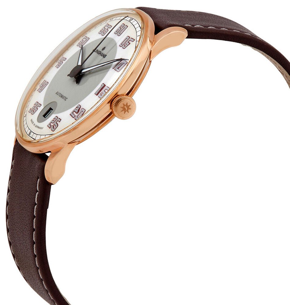 Junghans Meister Driver Automatic Rose Gold PVD Gray/White Dial Date Brown Leather Strap Mens Watch 027/7710.00