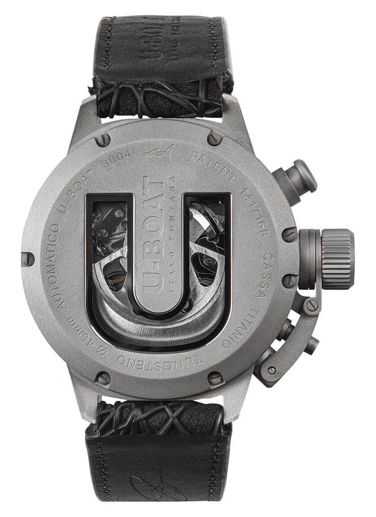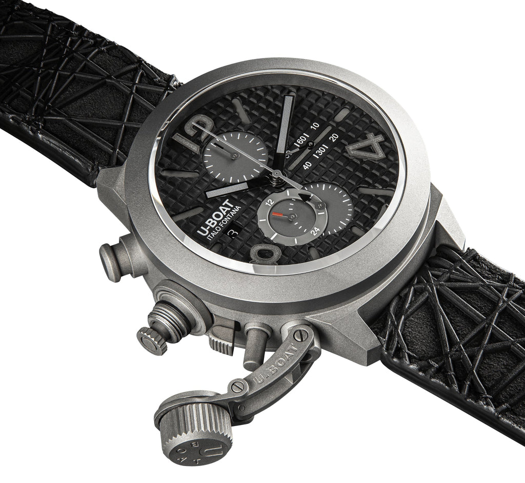 A symbol of balance between innovation and tradition, the Classico 45 collection's every detail oozes with modern refinement, while respecting a classic and timeless design. This Classico 45 chronograph is a limited edition of only 299 pieces and features a 45 mm titanium case that holds a mystical black metal dial with a waffle pattern and three superimposed layers under a scratch-resistant sapphire crystal and bordered on by a matte-finished tungsten bezel. It has black and luminescent hands with indices and Arabic numerals at the 4, 8 and 12 o'clock as hour markers, all treated with gray Super-LumiNova®. This "Destro" (right-handed) gents' sports chronograph watch is also equipped with a lefty crown, highly distinctive with its "canteen watch" inspired crown protective cap and lever with patented crown extraction system between the 8 and 9 o'clock positions, a discreet date aperture and a 24-hour indicator with a red hand. Chronograph functions include a central chronograph seconds hand, linear subseconds, and counters for 30 minutes and 12 hours. On the right side of the case is a fixed plate with its serial number while a similar plate etched with "TUNGSTENO" is situated at the 6 o'clock position. Fitted with a black Alcantara® rubber strap with a leather lining and secured by a titanium signed buckle. This watch also features a screw on exhibition caseback sealed shut by 7 external screws with a U-shaped sapphire window showcasing the Sellita caliber SW 500, a Swiss automatic chronograph movement personalized to U-Boat specifications, beating at 28,800 vibrations per hour generating up to 62 hours of power reserve and is water-resistant up to 100 meters/330 feet.