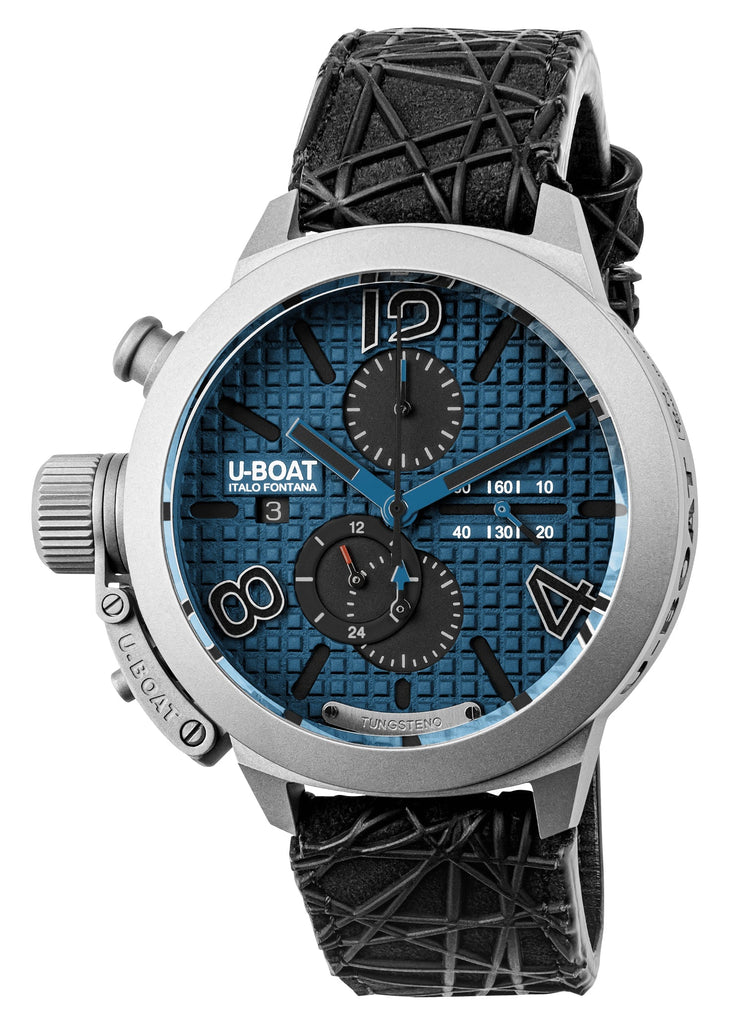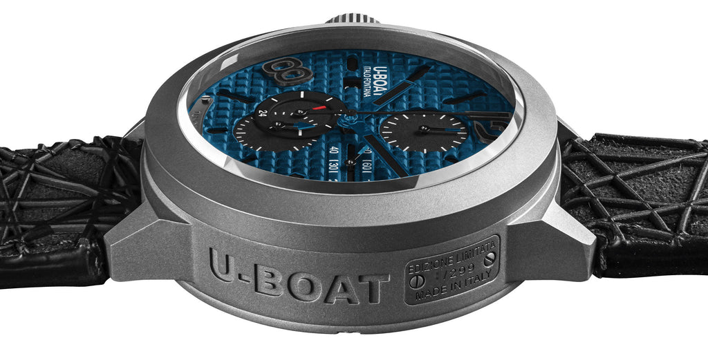 A symbol of balance between innovation and tradition, the Classico 45 collection's every detail oozes with modern refinement, while respecting a classic and timeless design. This Classico 45 chronograph is a limited edition of only 299 pieces and features a 45 mm titanium case that holds a hypnotic blue metal dial with a waffle pattern and three superimposed layers under a scratch-resistant sapphire crystal and bordered on by a matte-finished tungsten bezel. It has blue and luminescent hands with indices and Arabic numerals at the 4, 8 and 12 o'clock as hour markers, all treated with black Super-LumiNova®. This "Destro" (right-handed) gents' sports chronograph watch is also equipped with a lefty crown, highly distinctive with its "canteen watch" inspired crown protective cap and lever with patented crown extraction system between the 8 and 9 o'clock positions, a discreet date aperture and a 24-hour indicator with a red hand. Chronograph functions include a central chronograph seconds hand, linear subseconds, and counters for 30 minutes and 12 hours. On the right side of the case is a fixed plate with its serial number while a similar plate etched with "TUNGSTENO" is situated at the 6 o'clock position. Fitted with a black Alcantara® rubber strap with a leather lining and secured by a titanium signed buckle. This watch also features a screw on exhibition caseback sealed shut by 7 external screws with a U-shaped sapphire window showcasing the Sellita caliber SW 500, a Swiss automatic chronograph movement personalized to U-Boat specifications, beating at 28,800 vibrations per hour generating up to 62 hours of power reserve and is water-resistant up to 100 meters/330 feet.