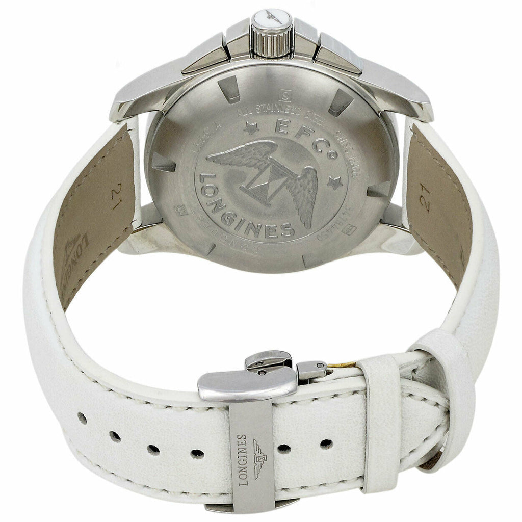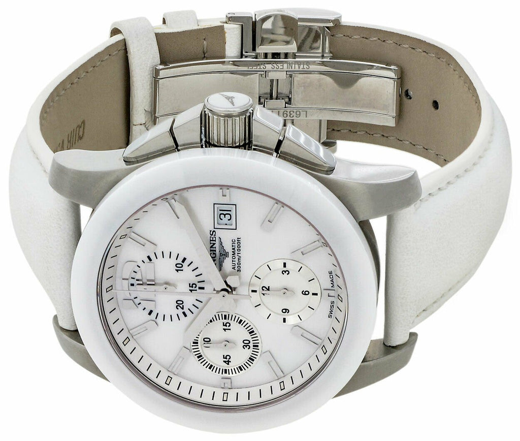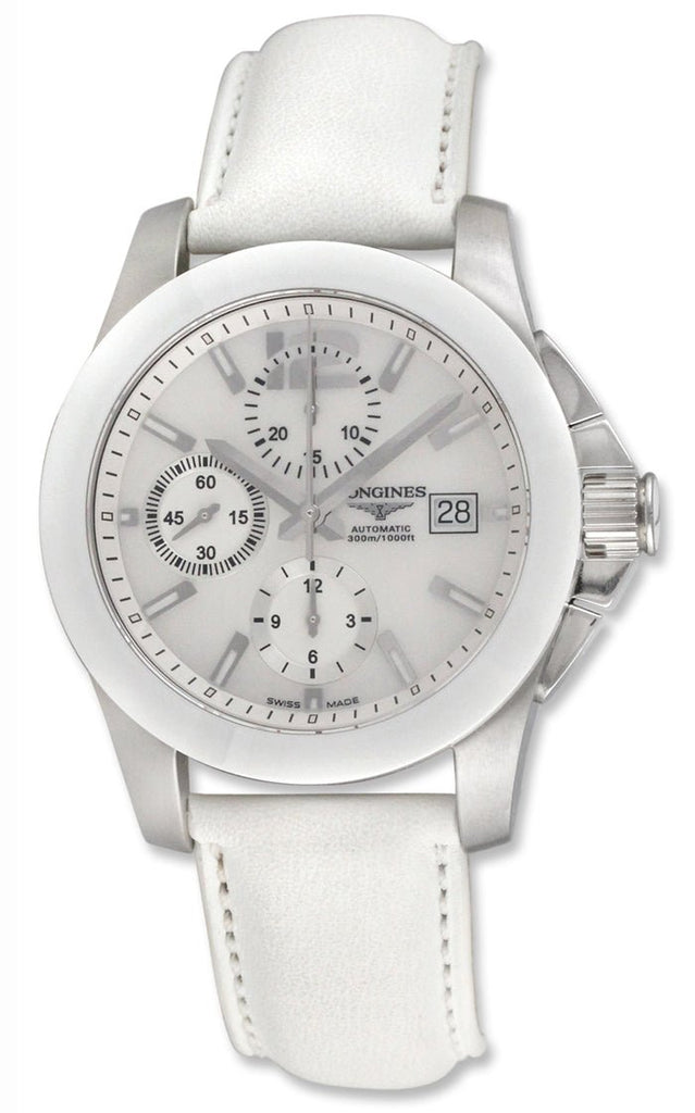 This Longines Conquest Automatic Chronograph Stainless Steel & Ceramic Mens Watch Model# L3.661.4.86.0 / L3.661.4.86.2 / L36614862 will make a perfect gift or a great addition to your collection. This Swiss watch features a Stainless Steel Case, White Ceramic Bezel & Crown, White Genuine Leather Strap, White Mother-of-Pearl dial set with a big superluminova luminescent 12 and 8 Index superluminova luminescent indices, Polished rhodium-plated hands with superluminova coating, Chronograph Functions, Date Display at the 3 o'clock position, Second Sub-dial at the 9 o'clock position, Anti-Reflective Scratch-resistant sapphire crystal, Swiss Automatic Chronograph Movement, Water-resistant to 300 meters/1000 feet. Two Year Limited Warranty.As all of our watches, this Longines Conquest Gents watch is BRAND NEW & comes with the original box, papers & warranty card.
