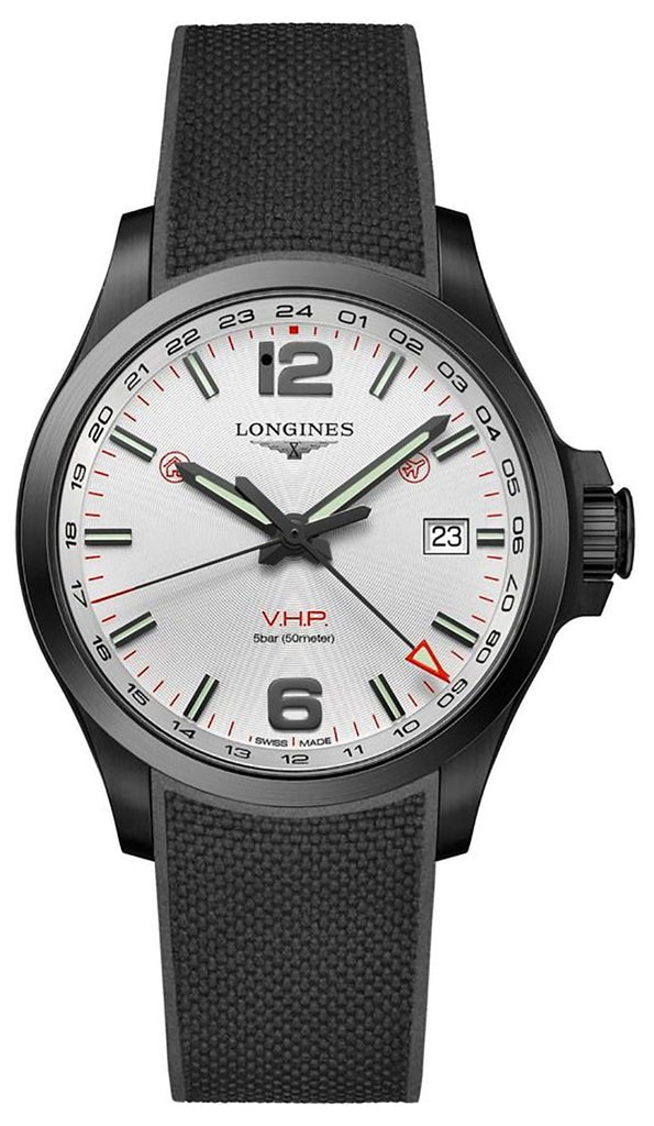 Longines Conquest V.H.P. GMT Black PVD Black Rubber Strap Silver Dial Perpetual Calendar Date Quartz Mens Watch Model# L3.728.2.76.9 / L37282769 features a black PVD case that holds the silver-tone dial. The dial has black and luminous hands and indices, and black Arabic numerals at the 6 and 12 o'clock positions; Perpetual Calendar date display window at the 3 o'clock position, 24-hour hand with time zone mechanism (GMT), and a solid case back. The black rubber strap has a folding clasp with push-button deployment. This watch runs on a Swiss quartz movement and is water-resistant up to 50 meters/165 feet.Like all of our watches, this Longines Conquest V.H.P. GMT Black PVD Black Rubber Strap Silver Dial Perpetual Calendar Date Quartz Mens Watch is brand new and comes in its original packaging.