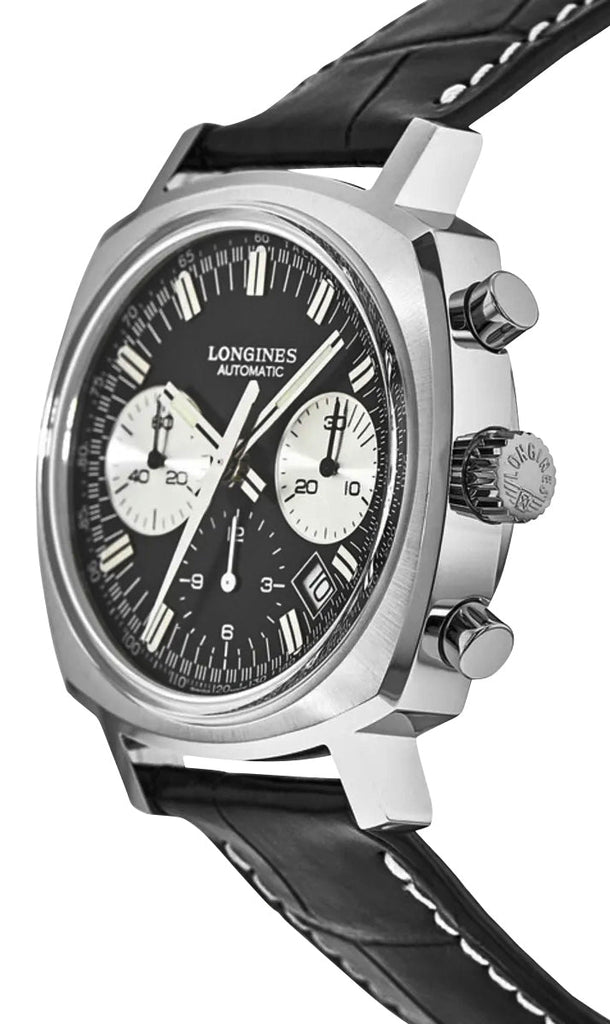 Longines Heritage 1973 Automatic Chronograph Stainless Steel Black Dial Black Leather Strap Date Mens Watch L2.791.4.52.0