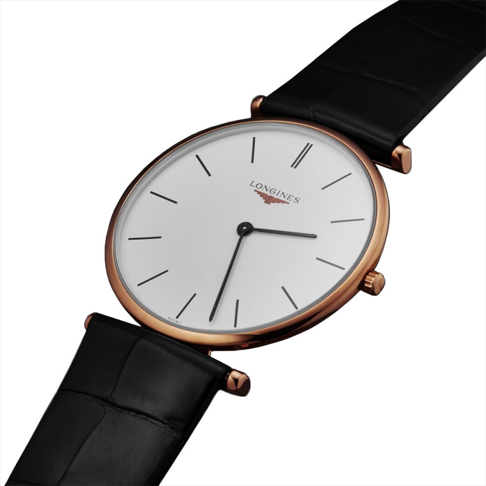 Longines La Grande Classique Rose Gold PVD White Dial Black Leather Strap Quartz Unisex Watch L4.755.1.92.2