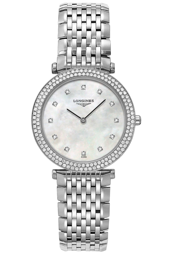 Longines La Grande Classique Stainless Steel & Diamond Women's watch Model # L4.515.0.87.6 / L45150876. This Longines Swiss watch is presented in a luxurious polished stainless steel case and bracelet with a push button deployment clasp, Case set with 144 Wesselton VVS diamonds - for a total of 0.648 carats, White Mother-of-Pearl dial set with black hand indicators, 12 Top Wesselton VS diamond hour markers - for a total of 0.034 carats, Scratch Resistant Sapphire Crystal, Push/Pull crown with Longines logo, Solid case back, Swiss Quartz movement, Caliber L420, Water resistant to 3ATM/30 meters/100 feet.As all of our watches, this Longines La Grande Classique Ladies watch is BRAND NEW, and comes in its original packaging.