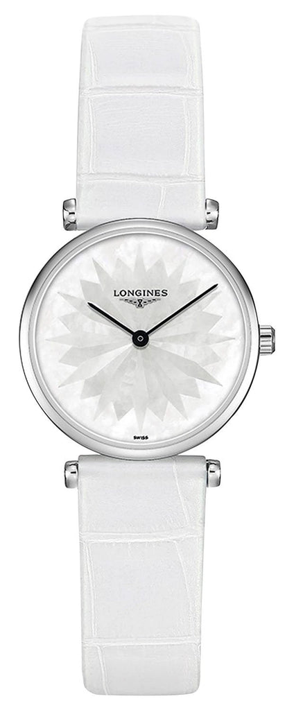 Longines La Grande Classique Stainless Steel Mother-Of-Pearl Dial White Leather Strap Quartz Womens Watch Model# L4.209.4.05.2 / L42094052 This Swiss watch features a 24 mm stainless steel case and an iridescent white alligator leather strap, white mother-of-pearl dial with star pattern set with black hand, Anti-Reflective Scratch-resistant sapphire crystal, Solid case back, Pull/push crown, Swiss Quartz Movement, Water-resistant to 30 meters/100 feet.Like all of our watches, this Longines La Grande Classique Stainless Steel Mother-Of-Pearl Dial White Leather Strap Quartz Womens Watch is Brand New, and comes in its original packaging.