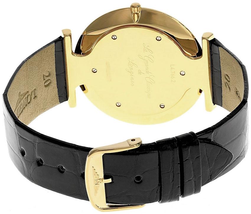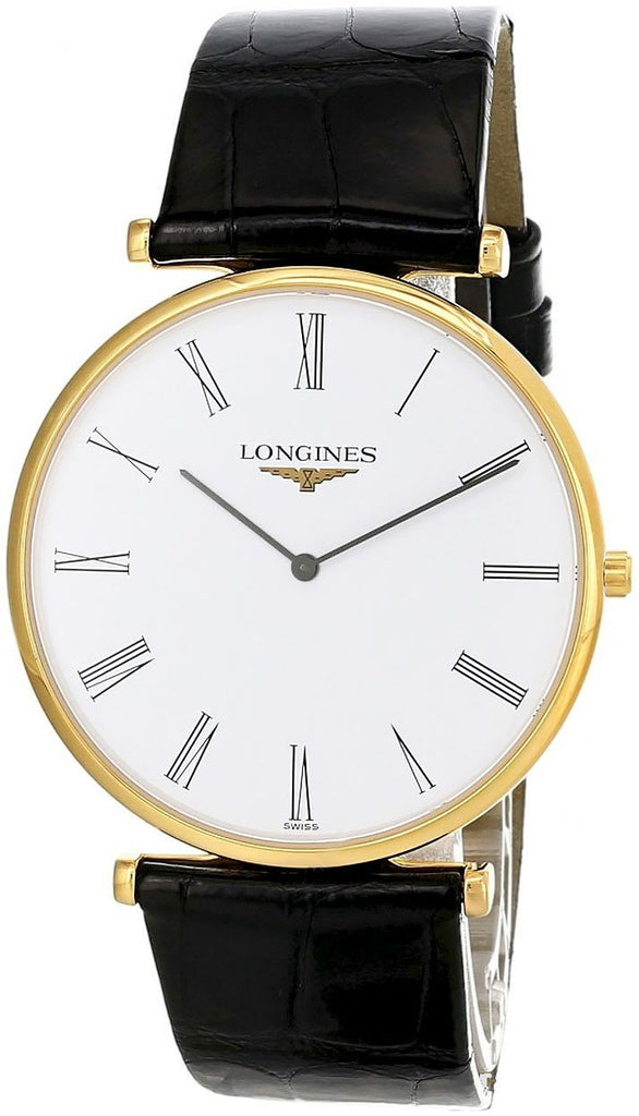 Longines La Grande Classique Yellow Gold PVD White Dial Black Leather Strap Quartz Mens Watch Model# L4.766.2.11.2 / L47662112 This Swiss watch features a 37 mm 18kt Yellow gold PVD coated stainless steel case, Black alligator leather strap, White dial set with black hand indicators & black Roman numerals hour markers, Anti-Reflective Scratch-resistant sapphire crystal, Solid case back, Pull/push crown, Swiss Quartz Movement, Water-resistant to 30 meters/100 feet.Like all of our watches, this Longines La Grande Classique Yellow Gold PVD White Dial Black Leather Mens Watch is brand new and comes in its original packaging.