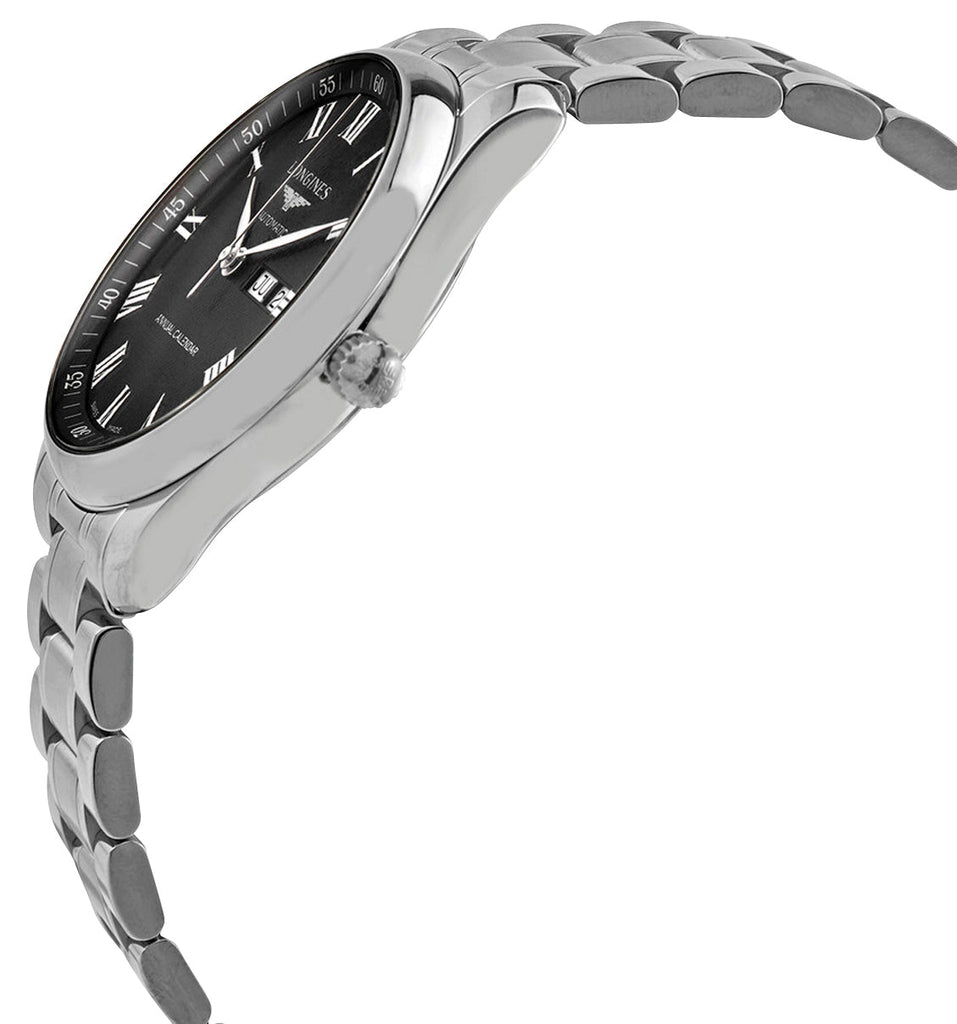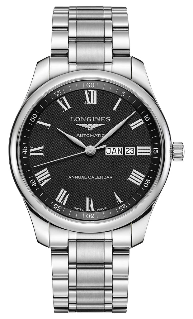 Since being launched in 2005, the Longines Master Collection combines classical elegance with excellent quality to ultimately produce exceptional timepieces. Introduced at Baselworld 2018 as Longines's first watch to be fitted with a mechanical annual calendar movement, this Master Collection features a 42 mm stainless steel case that holds an intricate black barleycorn dial under a scratch-resistant sapphire crystal and a polished fixed bezel. It has silver-tone leaf hands and white painted Roman numerals as hour markers. The beveled month and date windows are located at the 3 o'clock position adjacent to its signed crown. Other elements in white contrast are the dial texts, flange minute markers, and month/date background. It is fitted with a stainless steel bracelet and secured by a triple safety folding clasp with a push-piece opening mechanism. This watch also features an exhibition caseback showcasing the caliber L897.2, a Swiss automatic movement beating at 25,200 vibrations per hour, generating up to 64 hours of power reserve and is water-resistant up to 30 meters/100 feet.